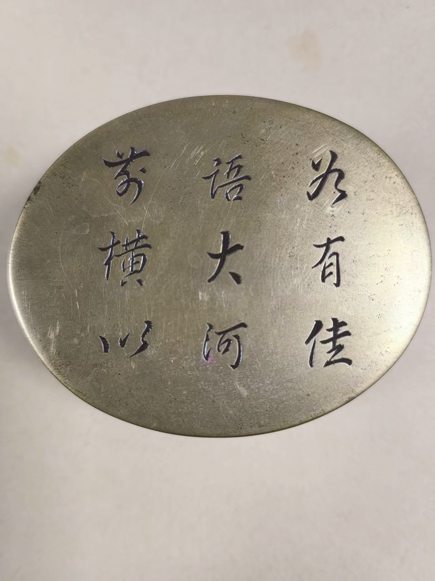 一次在朋友的茶室喝茶,朋友拿出一方椭圆形的铜墨盒给我们观赏,只见上面刻着“如有佳语,大河前横”。大家在鉴赏的同时开始探究这句话的意思。经查询才知道,这句话的意思是:如果有优美绝妙的诗句出现,那就像有一条大河横亘在面前一样,气势磅礴,令人震撼。这句话出自唐代著名诗人和诗论家司空图的《诗品二十四则·沈著》。就这样,在欣赏墨盒的过程中,我对这句话有了完整的了解。