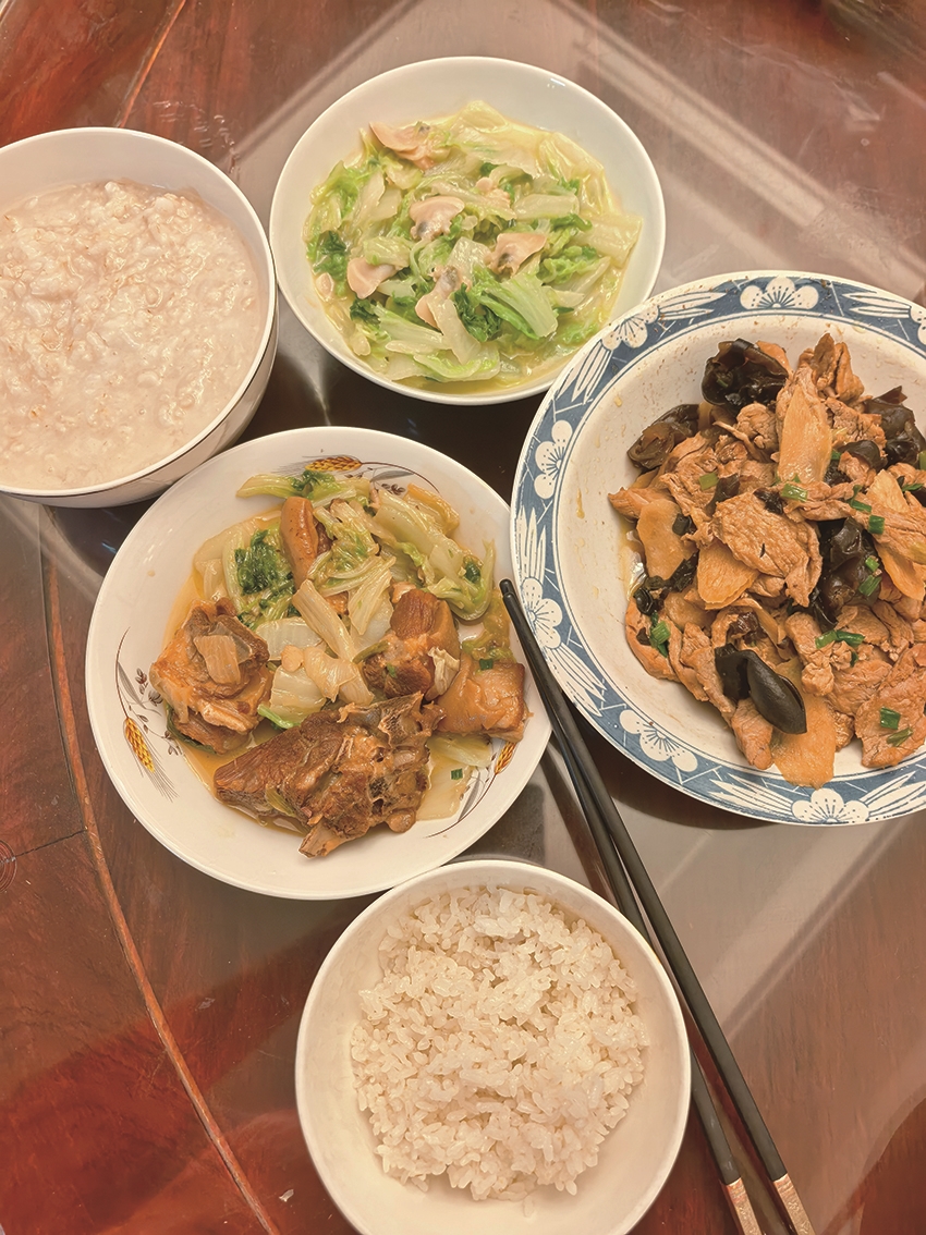 等我回到家,妻子已经把饭菜准备好,一边刷抖音一边等我。我觉得有点不对劲,凑过去一瞧,原来她吃的是稀饭配文蛤烧黄芽白菜。我呢,吃的是米饭配羊肉烧黄芽白菜。不过,我俩还有一道肉片炒木耳的共同菜。这时我才突然想起,下班前她在微信上问我晚上吃啥,我信手回“米饭”,可她想喝粥,于是就有了这顿“各自安好”的晚餐。