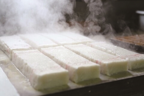 糕蒸制成型后用红色汁在两头各印上两道红线,也有的老师傅在米屑铺入蒸笼的时候就用红色粉勾勒出红线。有了红线的糕显得十分喜庆,又像极了洁白的毛巾,南通人管毛巾叫水巾,所以南通人的年糕又唤作水巾糕。水巾糕往家拿也是个技术活,要一条条码好在澡盆里,然后驮在自行车后座上,一个人在前面推,一个人在后面扶。拿回家的水巾糕要盖上干燥的真水巾,既保证晾透又防止被风吹皴裂。晾干后的糕放入加了明矾的水缸里可以储存一两个月不坏。吃的时候拿出来切片,可以复蒸,谓之烀;可以与粥一起煮,谓之烫;可以油炸再裹上糖稀,也可以放炉子上烤。