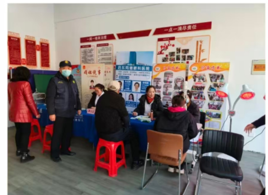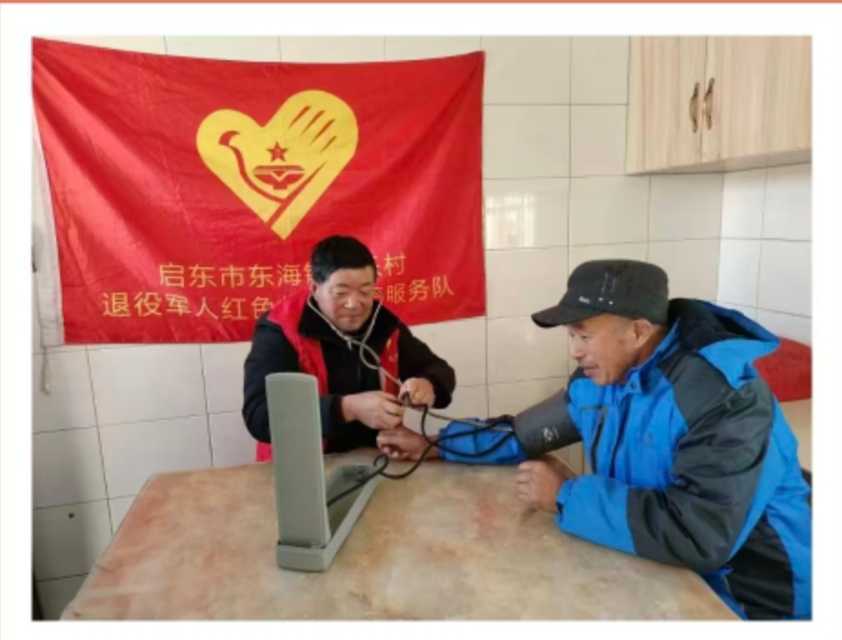 东海镇共乐村退役军人“红色先锋”志愿服务队为辖区居民提供血压测量服务。近期天气寒冷,人体血压易波动。志愿者一边记录数据,一边耐心叮嘱老人,普及日常注意事项,提醒按时吃药。