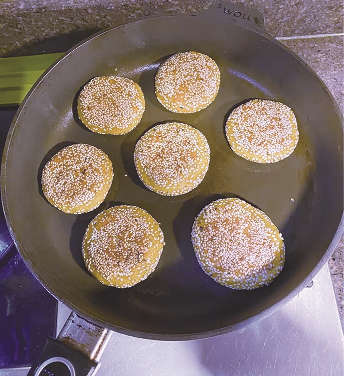 最后锦上添花,在圆饼两面撒上芝麻。南瓜饼生胚的制作就大功告成了。