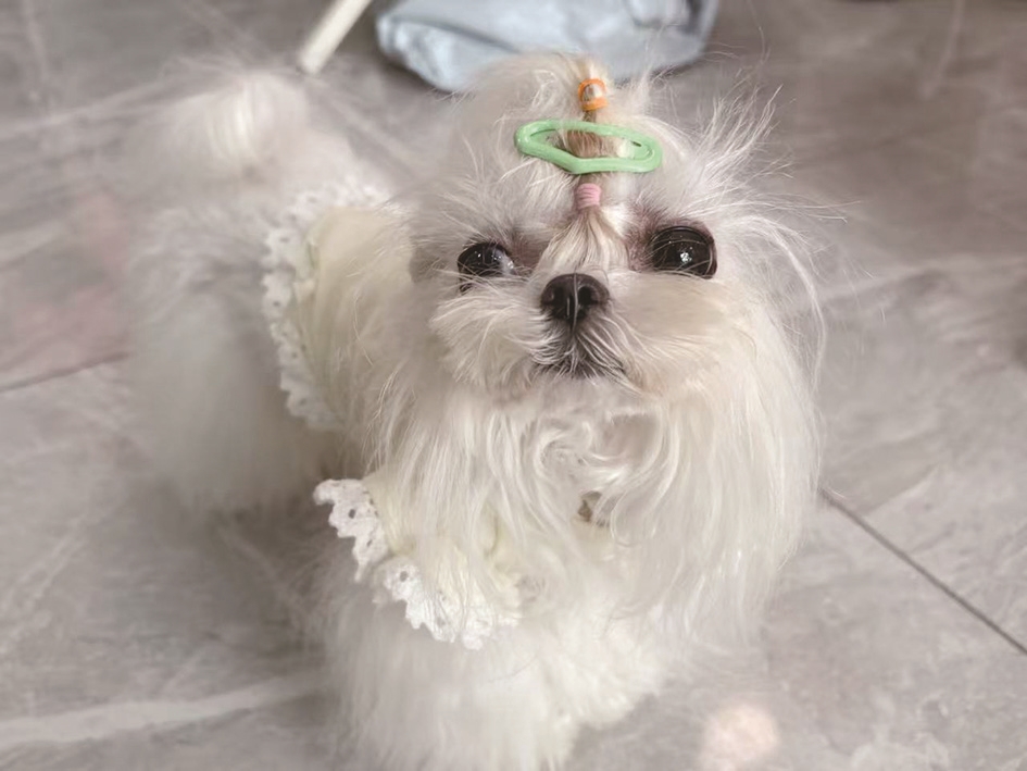 推开门,见到一只超小品种的马尔济斯,像个雪白的小绒球般端坐在妈妈膝上,任妈妈替她精心梳理毛发。妈妈挑了一根红皮绳,给她扎了一个可爱的小马尾,而后拍拍屁股,让她去铺好的垫子上排便。