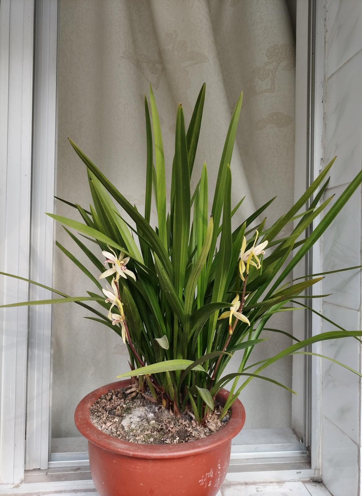 去年,夏天热的时日长,秋天一到,秋兰抓紧时机,连续出了三批花箭,幽香潜发,沁人心脾。稍后,蓄势待发。哪知冬天姗姗来迟,秋兰正好抓住适宜抽箭的气候,冒出三支,难怪陶渊明感慨“善万物之得时”。11月初,天气渐冷,兰花入房,我才发现它们一支刚刚破土,另两支已有一寸多高。这是我从未见过的,十分惊喜!终究气温偏低,那刚出土的一支不久夭折,不无遗憾,但虽死犹荣!因为它已为璀璨花开的理想作了一番生与死的拼搏。另外两支越过生命线,拔节生长,于11月中旬花开四度,打破历年批次纪录。
