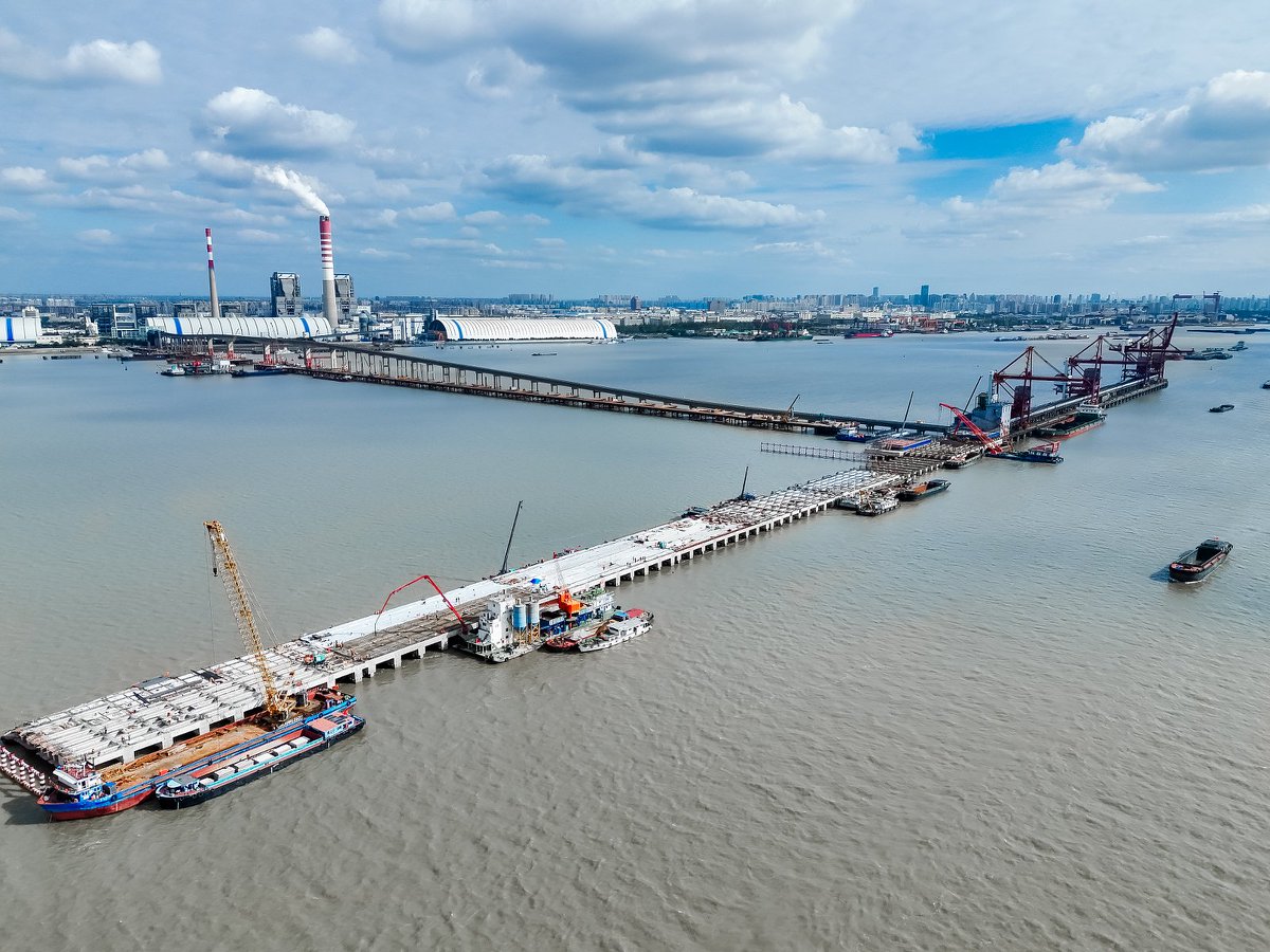 在长江下游澄通河段天生港水道左岸,横港沙外侧长江主泓水域,南通天生港发电有限公司码头工程项目建设现场同样繁忙,290名建设者正有序进行桩基与结构作业,一座现代化能源码头已初具雏形。