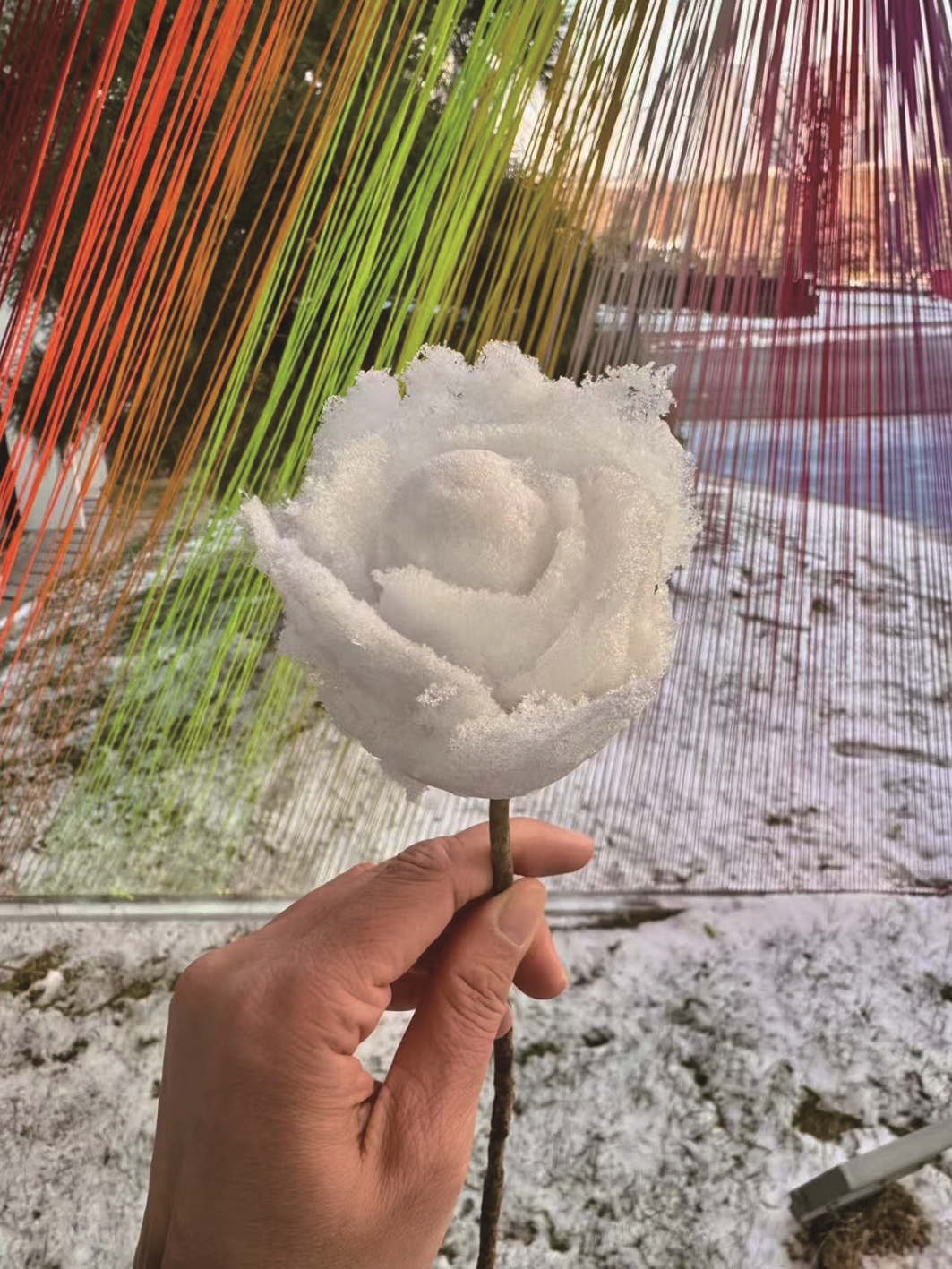 她抓来一把雪,将雪在树枝的一头攥紧,形成雪玫瑰的“花蕊”。接着,她又掏出一张废弃的卡片,在草地上铲起一片薄薄的雪,她翻转卡片,将这片雪在手心压成薄薄的雪片,又将雪玫瑰的“花蕊”放在雪片的中央,轻柔攥紧,形成玫瑰最里层的花瓣。如此反复,一片又一片的花瓣就在花蕊周围“生长”出来。我留意到,每一片晶莹透亮的雪片黏合在“玫瑰花蒂”上的时候,小崔都有意识地将攥拢的用力点放在下端,而让上方的雪片微微张开。只过了一分多钟,一朵纯净无瑕、晶莹的雪玫瑰就在她手中完美绽放。