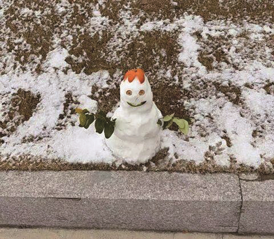 路过小区草坪时,蓦然与一个小小的雪人相遇。不过一尺来高,头顶橙红果皮如戴绒帽,两粒石子眼睛圆溜溜望着天空,一弯绿叶嘴角上扬,两片细枝作臂,斜斜伸着,仿佛在拥抱这场匆匆的雪。