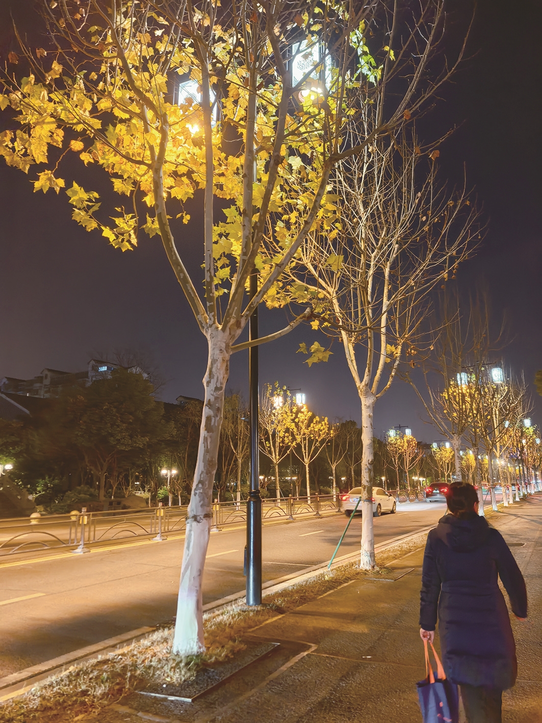 记忆中,我们已经好久没这样一起走了。路上,黄色的盲道在脚下延伸,灰色地砖间铺满了梧桐叶,细碎的叶片静静躺在缝隙里。夜色温柔而深邃,街边的路灯一盏盏亮起,暖黄的光晕在寒风中轻轻散开,像为我们的步伐铺了一条温润的光路,将树影和人影柔和地交织在一起。