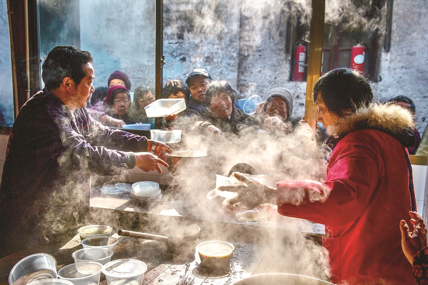 大铁锅咕嘟作响,腊八粥在锅中翻涌,米香、豆香、枣香随着蒸汽飘进巷子深处。排队的人多是寺街附近的居民,有拄杖的老人、背书包的孩童,也有远道而来的年轻人。大家捧着碗,在热气里静静等候,仿佛这一碗粥是冬日里最温暖的约定。