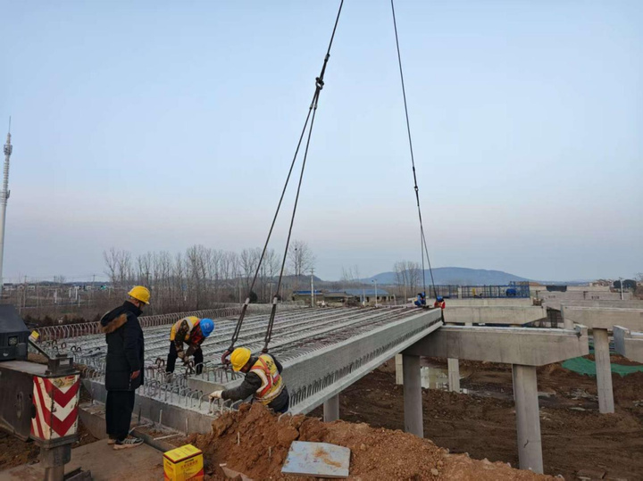 日前,宁盐高速公路南京段NY-NJ2标X202分离立交桥首片装配式预应力混凝土空心板梁架设完成,为后续桥面、护栏等附属工程施工创造有利条件。