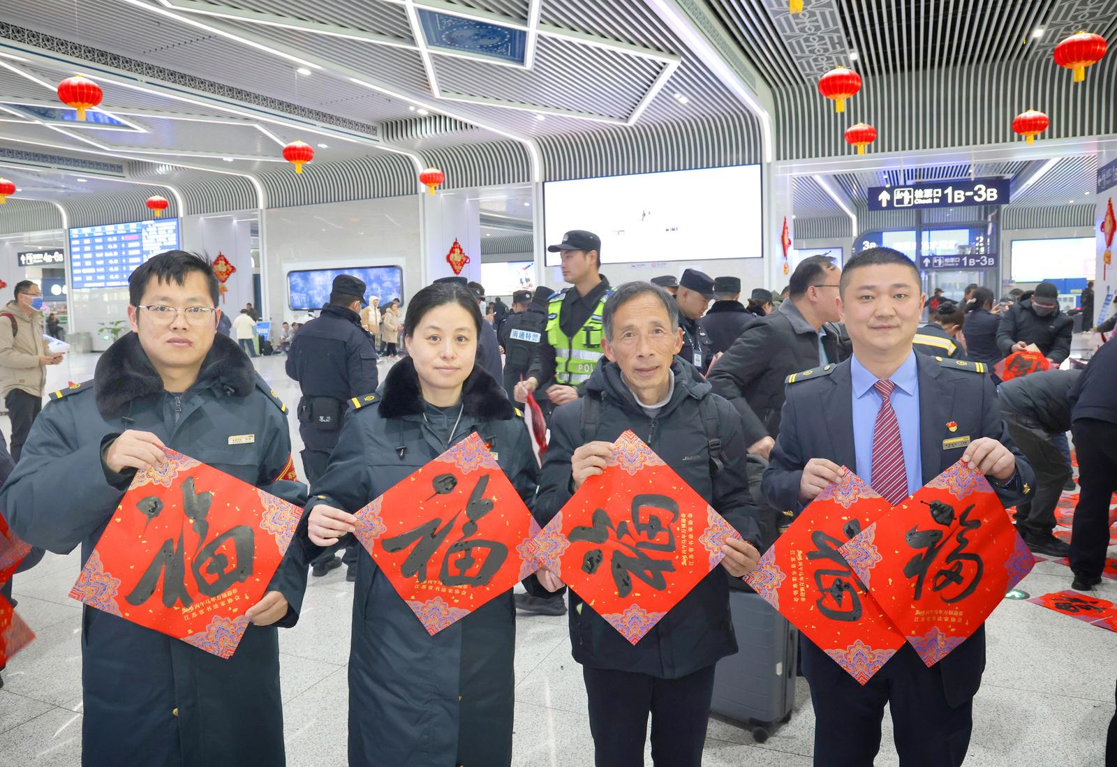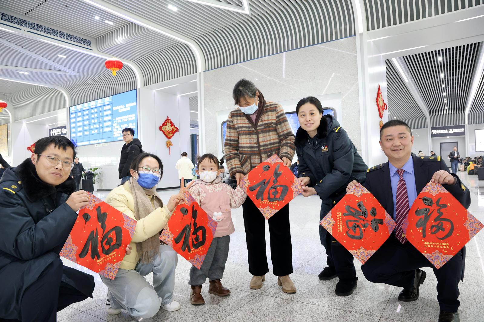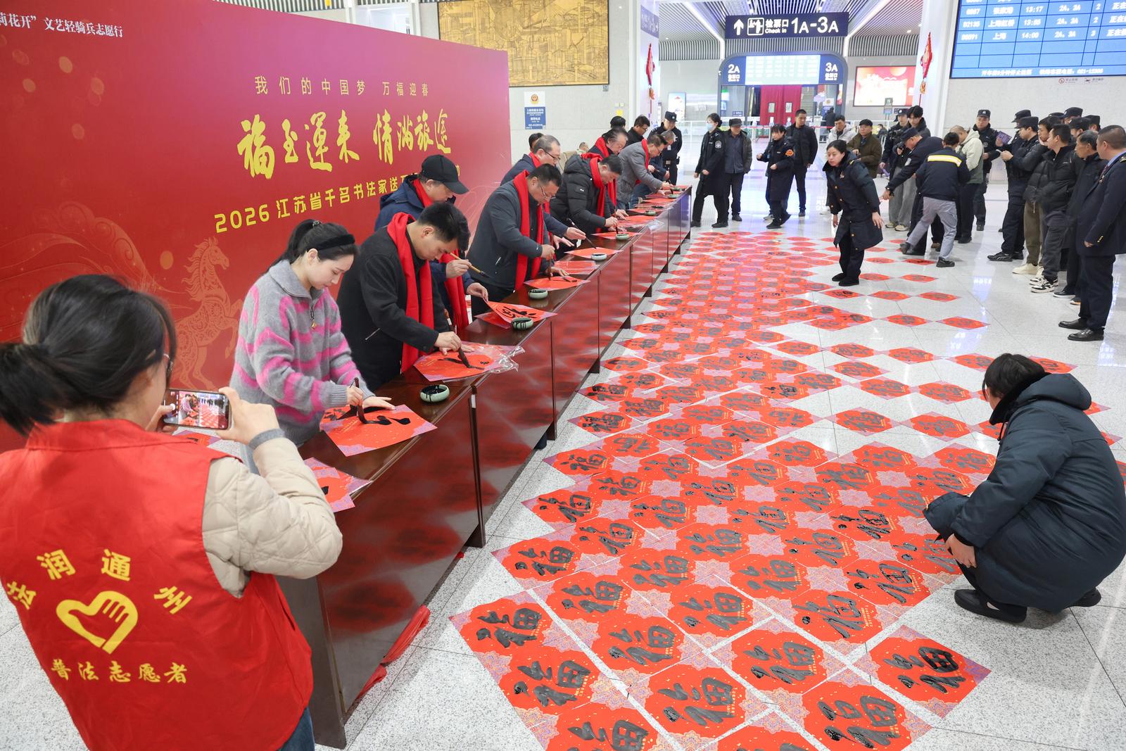 2026年2月1日,南通西站携手南通市书法家协会举办的“福至运来 情满旅途——我们的中国梦·万福迎春”活动在候车大厅举行,南通市多位书法家应邀到现场挥毫泼墨,车站工作人员、铁路民警等将“福”字送到旅客手中,送上新春的祝福。