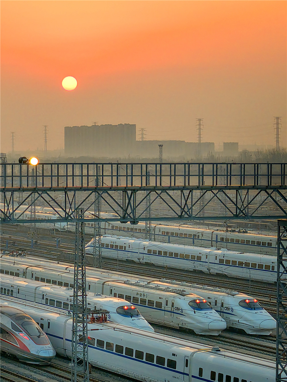 2026年2月1日,日出时分在市崇川区幸福街道辖区拍摄的南通动车所整装待发的动车组和驶出动车所的动车组。