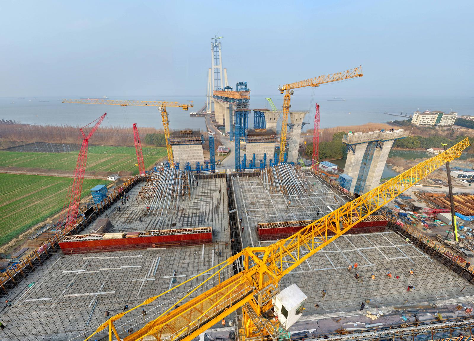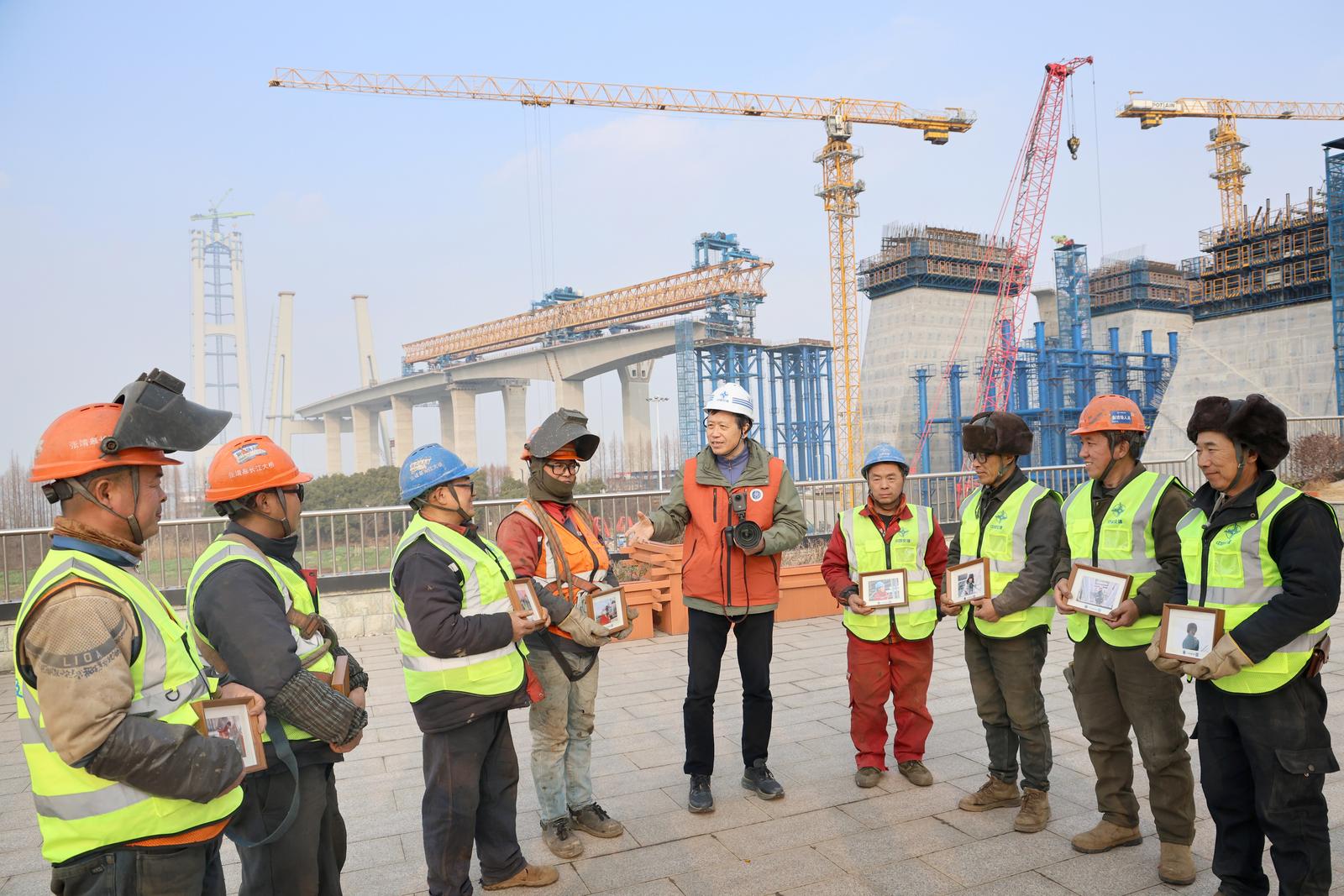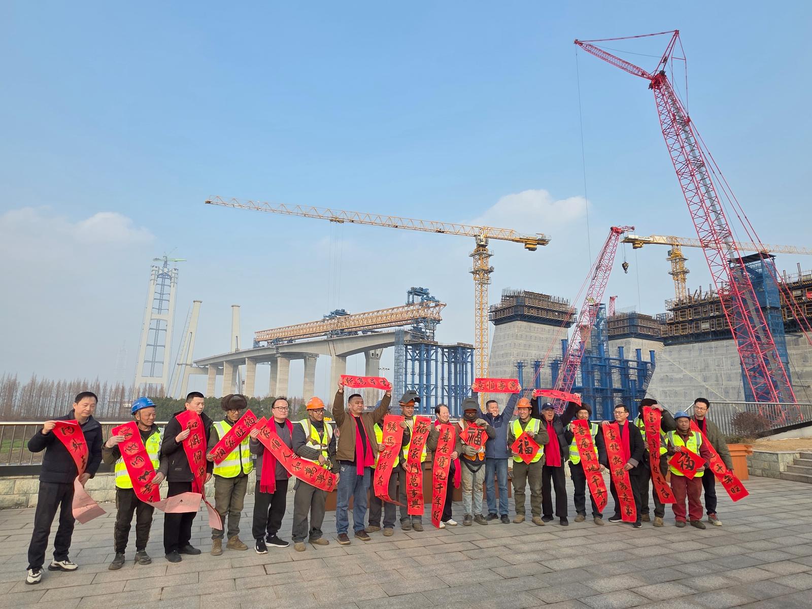 2026年2月2日,江苏省交通文联组织摄影家,张家港市硬笔书法协会组织书法家,共同走进张靖皋长江大桥工地,为建桥工人拍照片、写春联,为工人回家过年备好“年货”。目前,大桥南航道桥主塔封顶,锚碇上部结构锚块施工已完成三分之二,现场施工如火如荼,节前施工热火朝天。