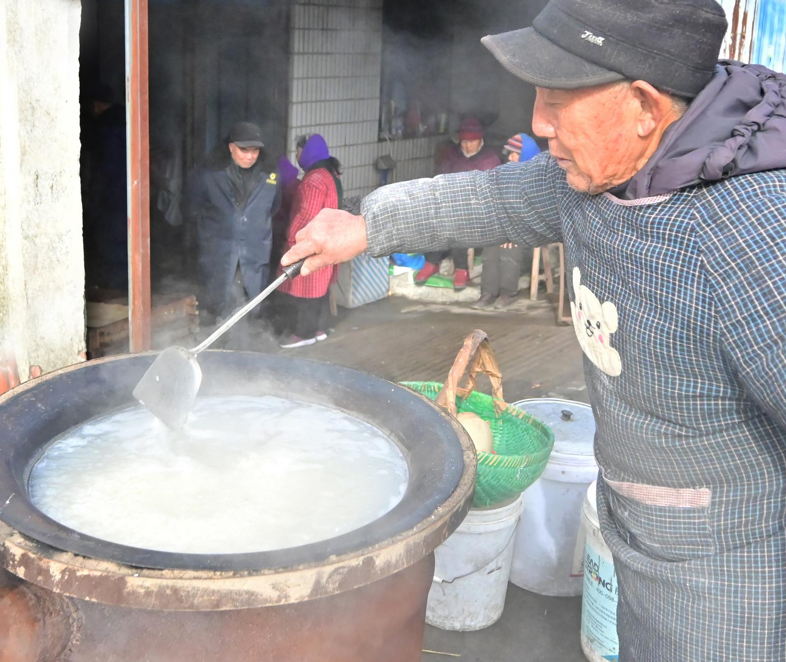 记者在采访中了解到,这位馒头加工点老板叫吴迪全,是土生土长的本地人,今年已经77岁了,帮村民加工蒸馒头已有二三十年了,实际每年为村民加工馒头也就过年前的20多天,不为赚钱,只为过年时乡村里传统发酵工艺蒸馒头的坚守。在加工点帮忙的师傅们大都是附近有着丰富经验的70岁以上的村民,每年进入腊月后,这个加工点成了当地热闹的“年味”聚集地,预定蒸馒头的村民们自备好猪肉萝卜丝、豆沙、咸菜肉丝等各种丰富馅料纷至沓来,加工点内揉面做馒头的、煮粥调酵的、烧锅炉的、放馅整形的、上笼蒸制的……每道工序都忙得不亦乐乎,还有亲自操持传统发酵流程的吴老板,他们在各自岗位上边做边聊着如今幸福生活的点点滴滴,整天喜乐喧阗不断。
