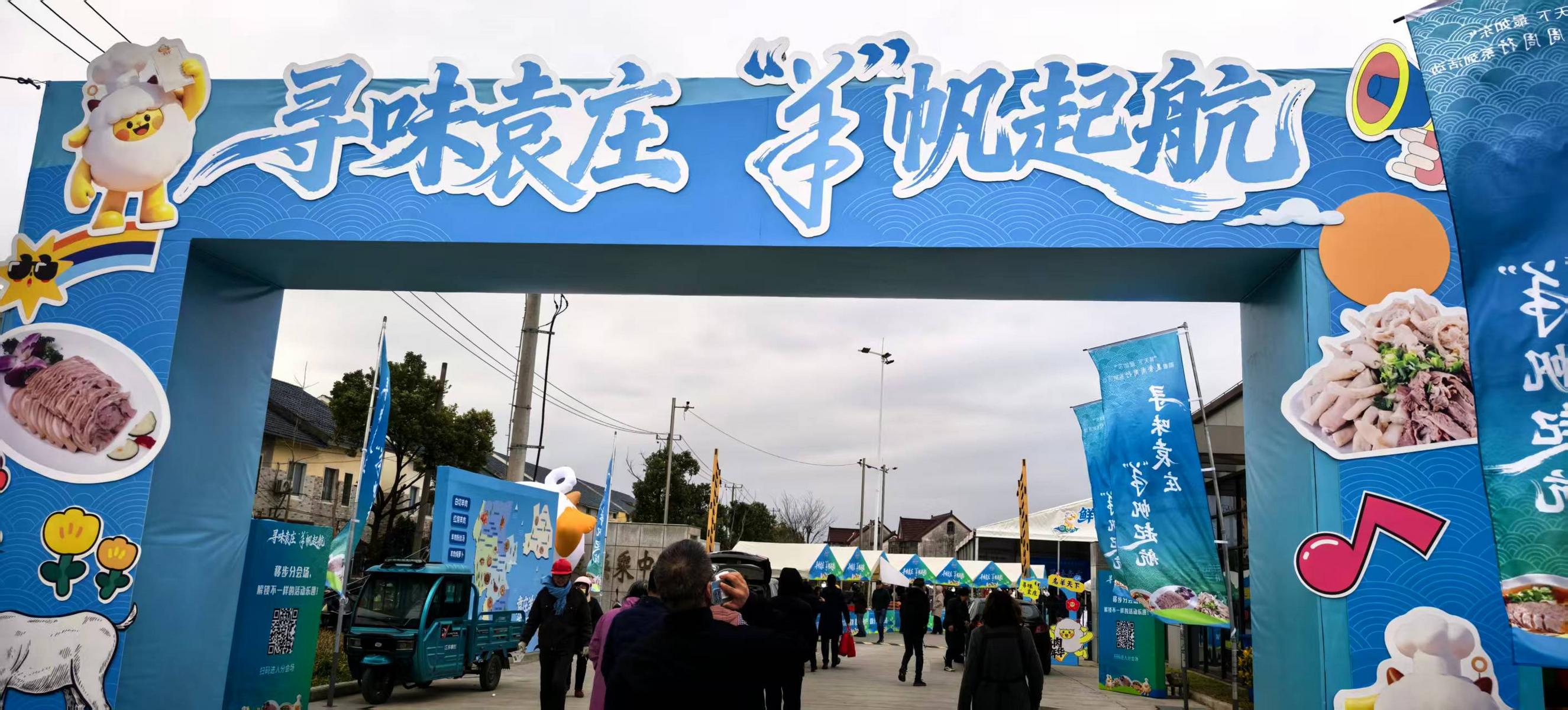 汽运站摇身一变,成了集市。临时搭建的方形门楣上“寻味袁庄 ‘羊’帆起航”八个大字赫然入目。顺着南墙根,也支着一长溜帐篷,色调与北面朝南的袁庄羊肉体验馆类似,青蓝相间,与放在摊位上的红红黄黄的盆儿篮子对比鲜明。售卖的有非物质文化遗产炒米、大袁庄家禽、特色水产、叮叮烘焙、秋香海鲜,海河滩的海河食品、小慧烧烤、家庭私菜、武松弟烧饼、酱香饼,戴南陈嫂大米、瑞瑞的甜品蛋糕、会飞的旱鸭大头鹅、饼小轩,濮桥鸡蛋、娃娃菜、控糖米,竹园的藤茶、荞麦粉、麻虾酱、绿耕园大米、春卷,赵港羊肉串、黑塌菜、老窖馒头,孙庄葡萄、老酵饼、猪头肉,时桥村香肠、咸肉、鸡蛋,朱庄的豆皮、汤圆,小康村芋头……琳琅满目,目不暇接,无不流溢着本乡本土的气息。其中最受欢迎的,自然是羊肉摊位。李氏羊肉、金龙羊肉、朱大羊肉、缪记羊肉……这里聚集了袁庄卖羊肉的商家巨头,他们厨艺精湛,售卖的羊肉鲜香纯正。冬吃羊肉赛人参,春夏秋食亦强身。也许是广告做得好,也许是口碑传得远,康氏羊肉摊前早已被围得水泄不通,这便是百年传承的魔力。一口入魂,慢火细炖的鲜嫩,那是儿时灶台边的温暖记忆,是家的味道,是乡愁的共鸣,怎能不催生购买欲呢?