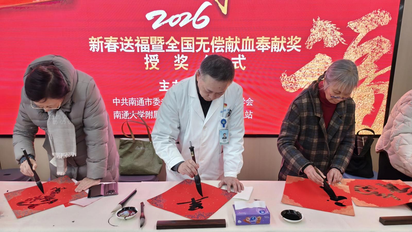 灵蛇辞旧岁,金马迎新春。在2026年新春佳节来临之际,为弘扬无偿献血的公益精神,致敬热血奉献的爱心人士,为市民送上新春的美好祝福,2月2日上午,由中共南通市委老干部局、南通市医学会、南通大学附属医院、南通市中心血站联合主办的“送爱送福传暖意 献血献爱守健康”2026年新春送福暨全国无偿献血奉献奖授奖仪式在通大附院东院区举行。