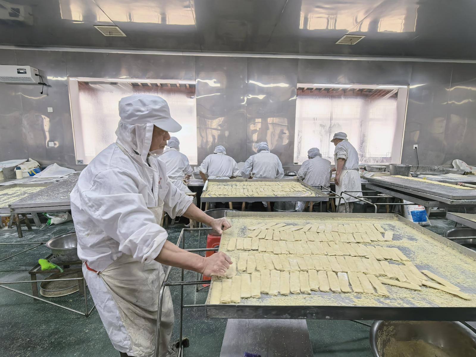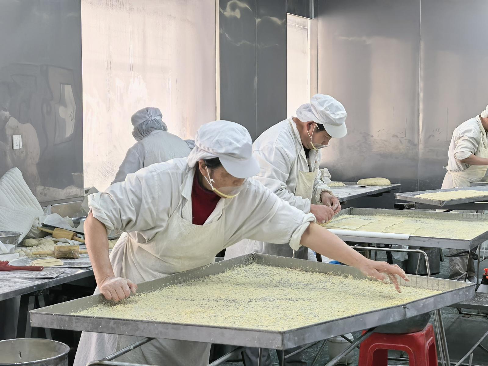 制饼车间被清晰地划分为三个功能区,揉面师傅与烘烤师傅组成固定班组,分工协作、默契十足。