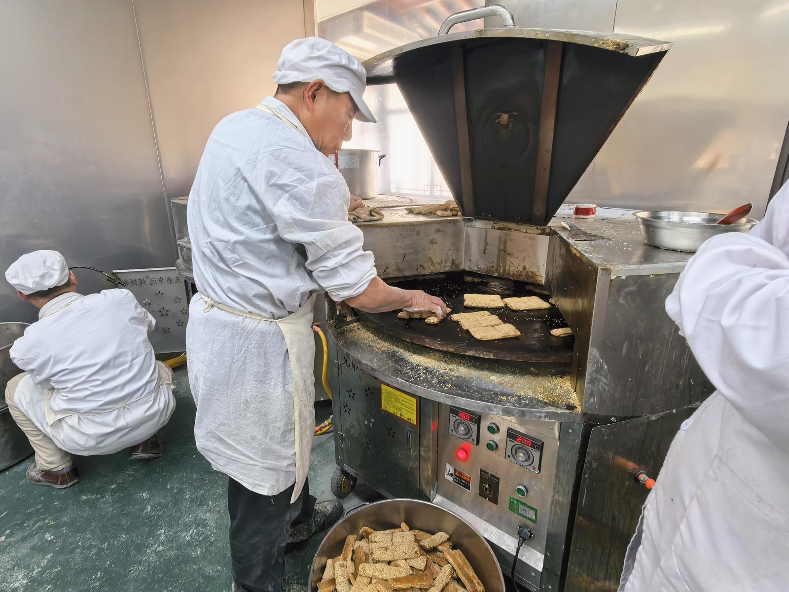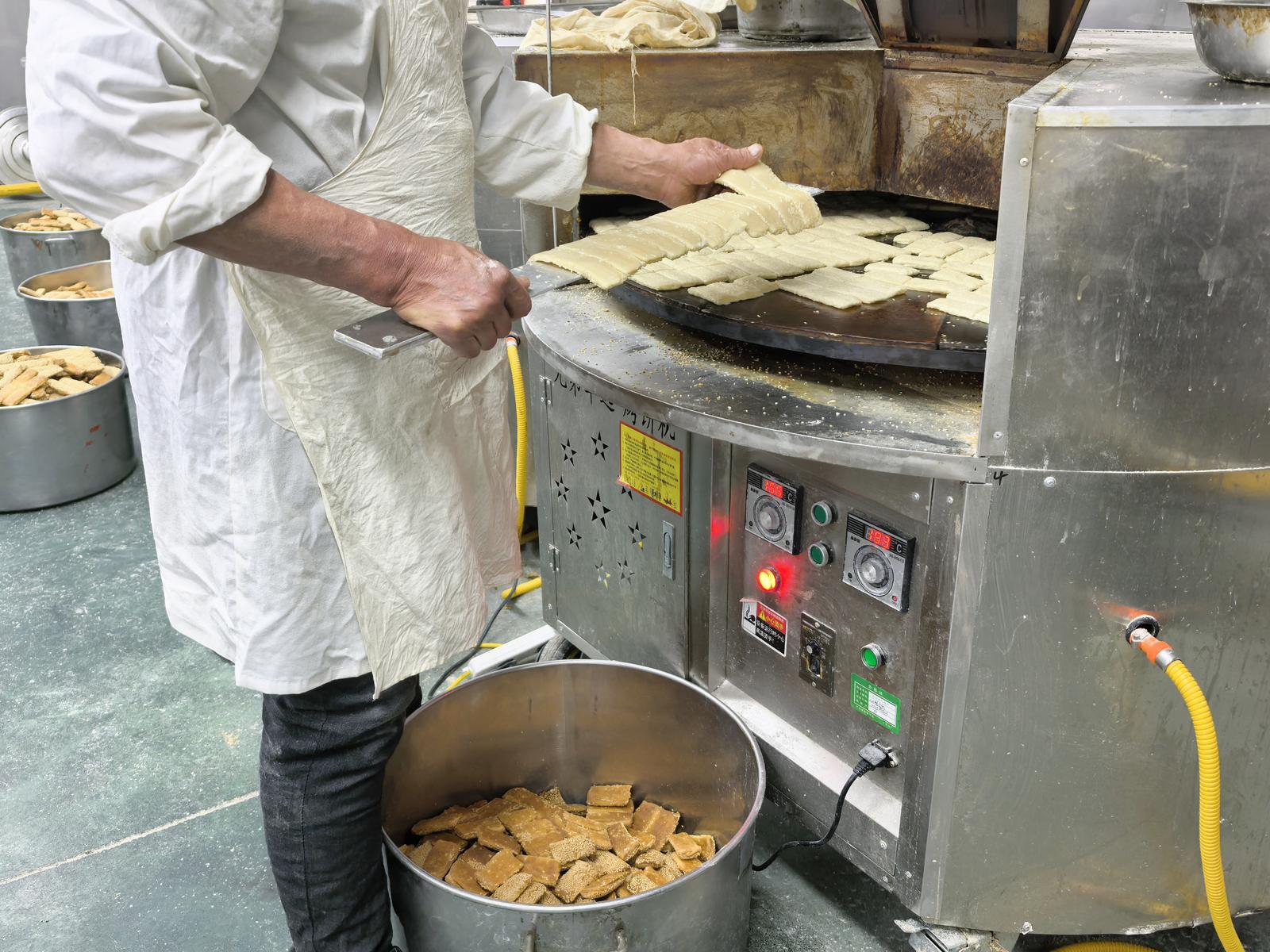 循着愈发浓郁的香气往前走,便到了上麻环节。芝麻香是西亭脆饼最鲜明的标识:只见装满炒制好的白芝麻的模具整齐排列,工人先将擀制好的小长条面胚逐一放入模具,再用力晃动模具,让每一根面胚都均匀裹上白芝麻,颗粒饱满的芝麻紧紧贴合饼皮,经烘烤后便会释放出醇厚的香气,成为脆饼口感的点睛之笔。
