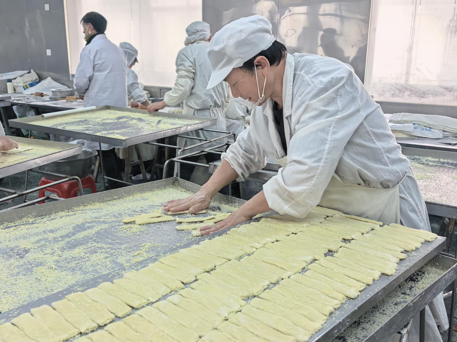 凌晨3时,当大多数人还在熟睡时,制饼工人们就陆续到岗。老面发酵是脆饼口感的关键,需耗时5小时耐心等待,再经过烫子酵、接种等步骤,加入水、油、面调制成嫩酵。受手工制作局限,临近春节,目前工厂每天用工100多人、工作10小时才能撑起厚重的年味。
