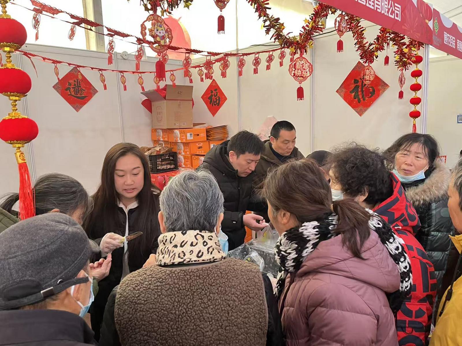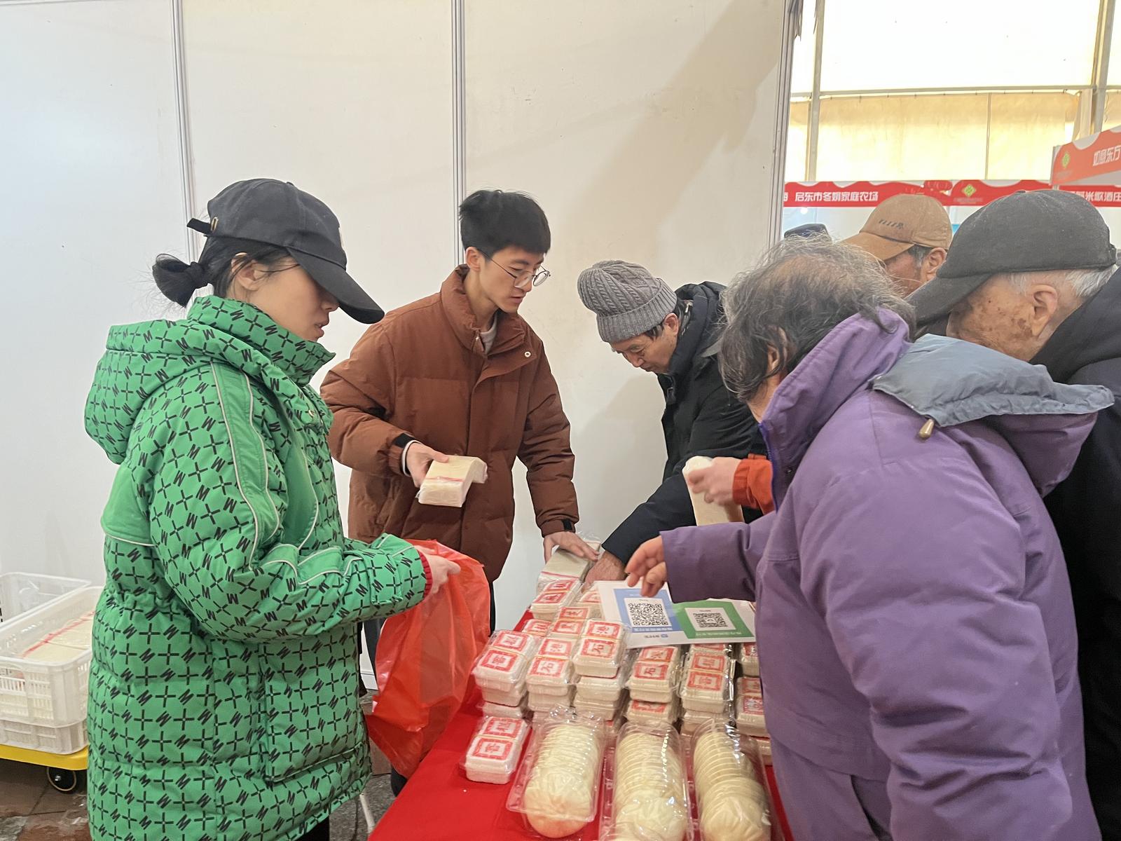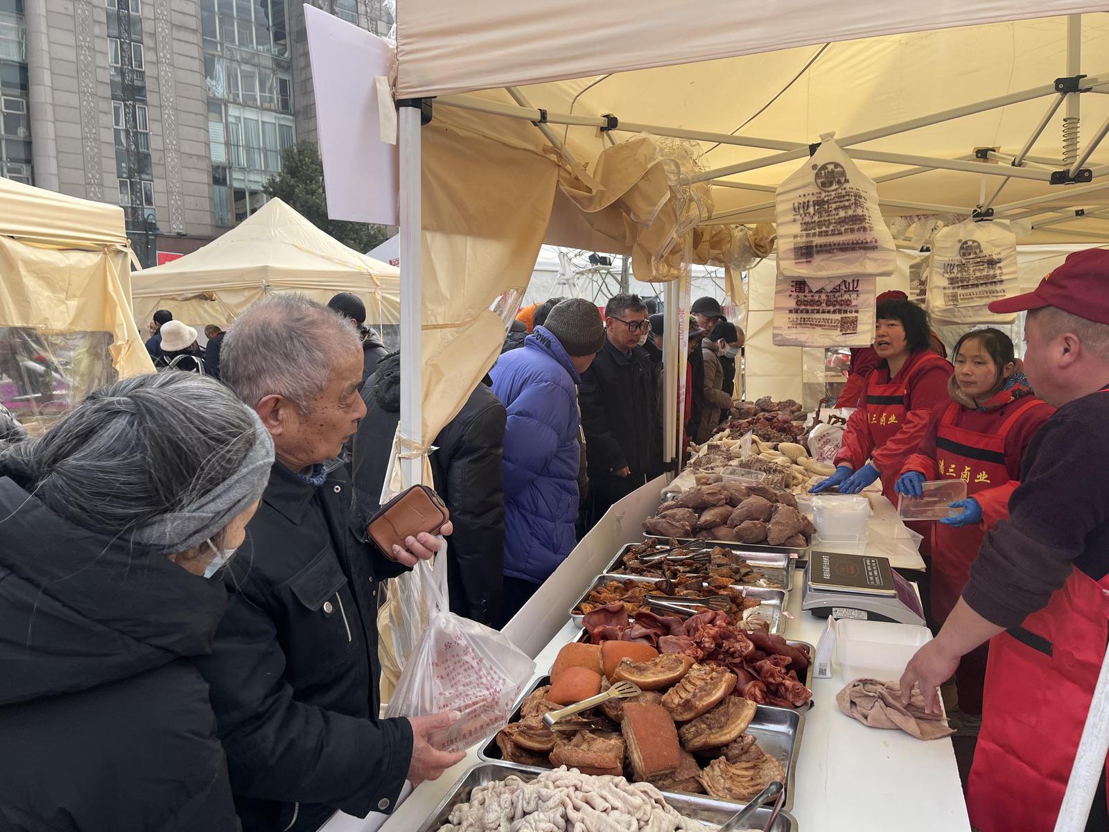 不远处,如皋市白蒲三香斋茶干有限公司展位前,往来顾客络绎不绝,散装捆扎的茶干很快销售一空,两日销售额近八千元;海安市供合商贸有限公司的猪肉摊位前更是排起了长队,新鲜的猪肉色泽鲜亮、纹理分明,恰好契合市民年末灌香肠、办年货的采购需求,当日销售额便突破七千元;景福斋中式糕点展位上,桃酥、脆饼等传统糕点琳琅满目,香酥的口感引得不少老人试吃、选购……