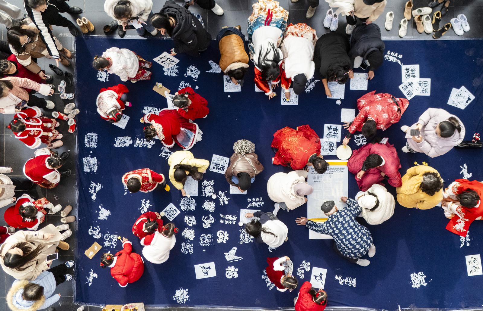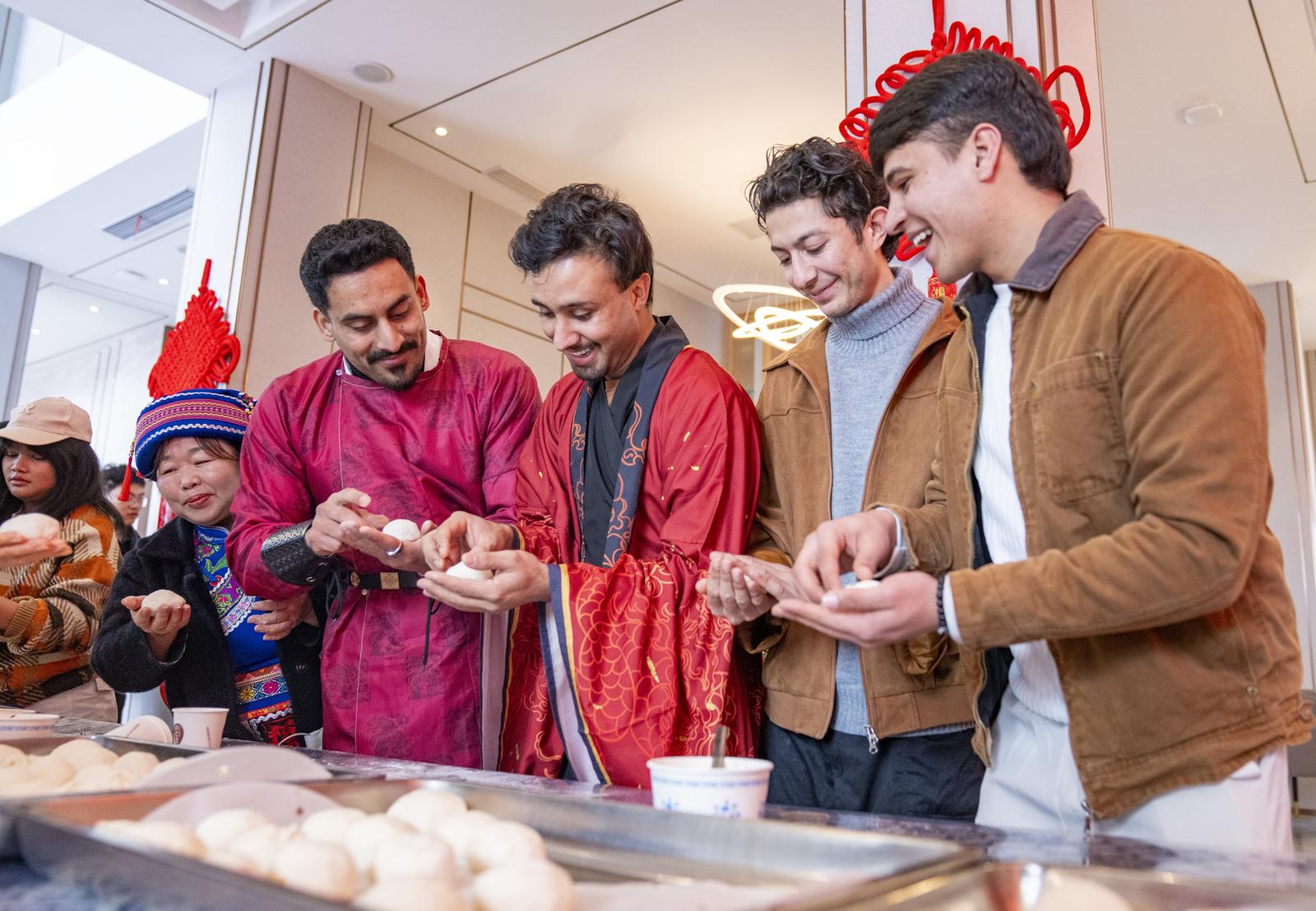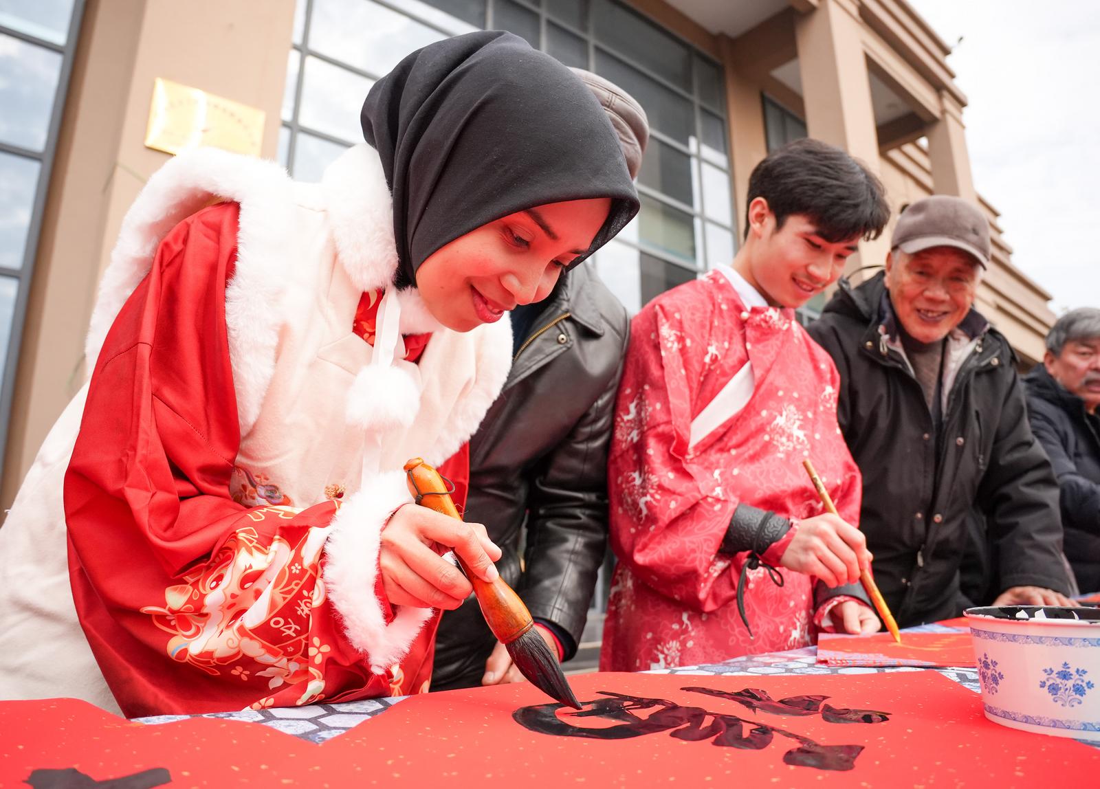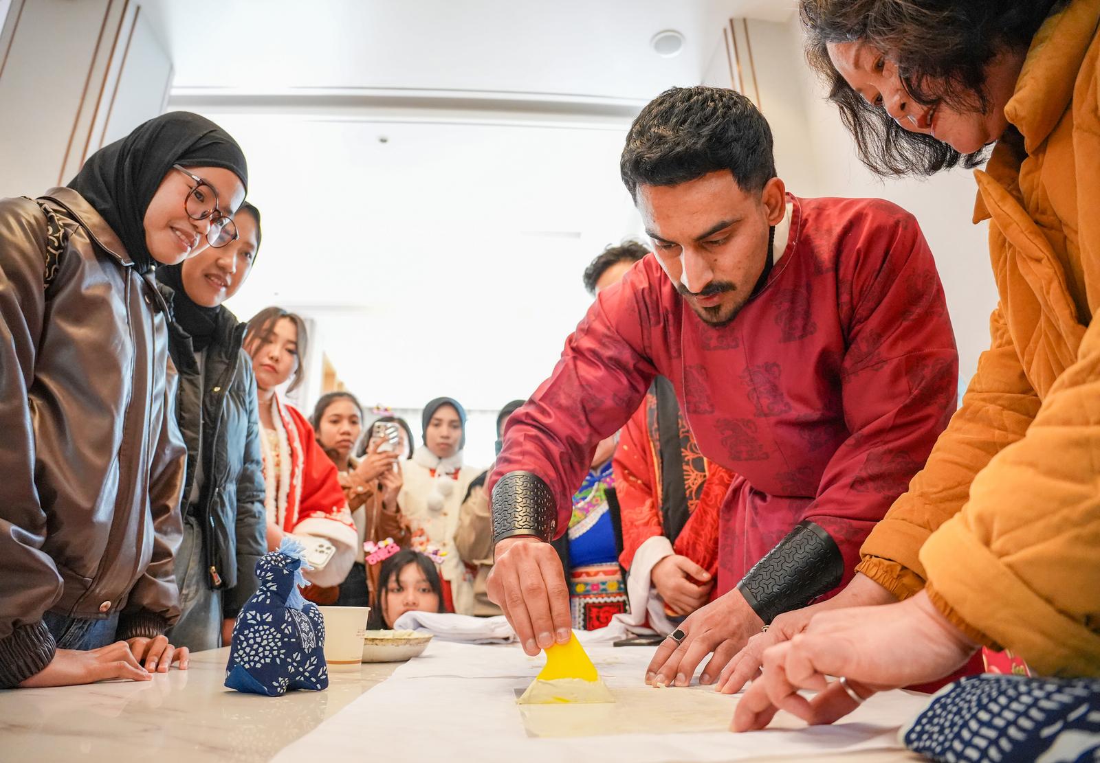 这是一场让群众“看得见、摸得着、做得了”的沉浸式体验,更是二甲镇以非遗为媒,让古老技艺扎根基层、融入生活的生动实践。来自巴基斯坦、印度尼西亚、老挝等国家的15名留学生,与社区居民共同体验蓝印花布拓印、制作福气包子、书写春联“福”字等项目,感受中国传统文化,体验喜庆中国年。