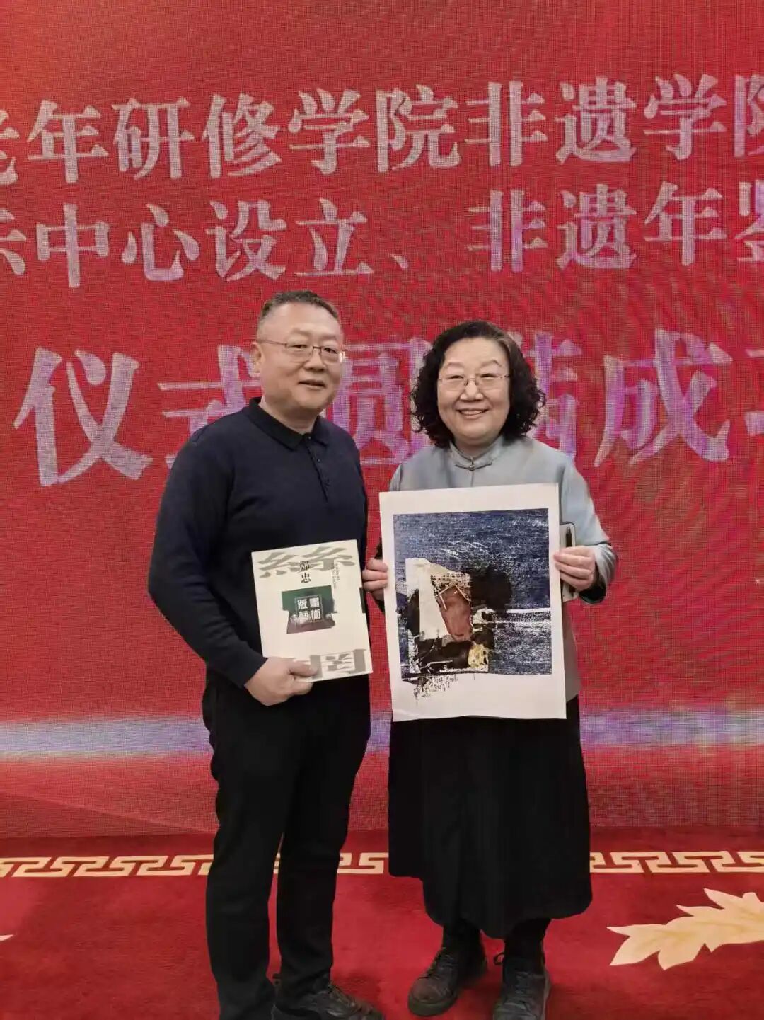 华夏希望基金健康医养工作委员会秘书长刘中代表签约艺术家郑忠向北京东方老年研修学院院长杨文霞捐赠作品。杨院长是非遗学院项目的发起人和负责人。