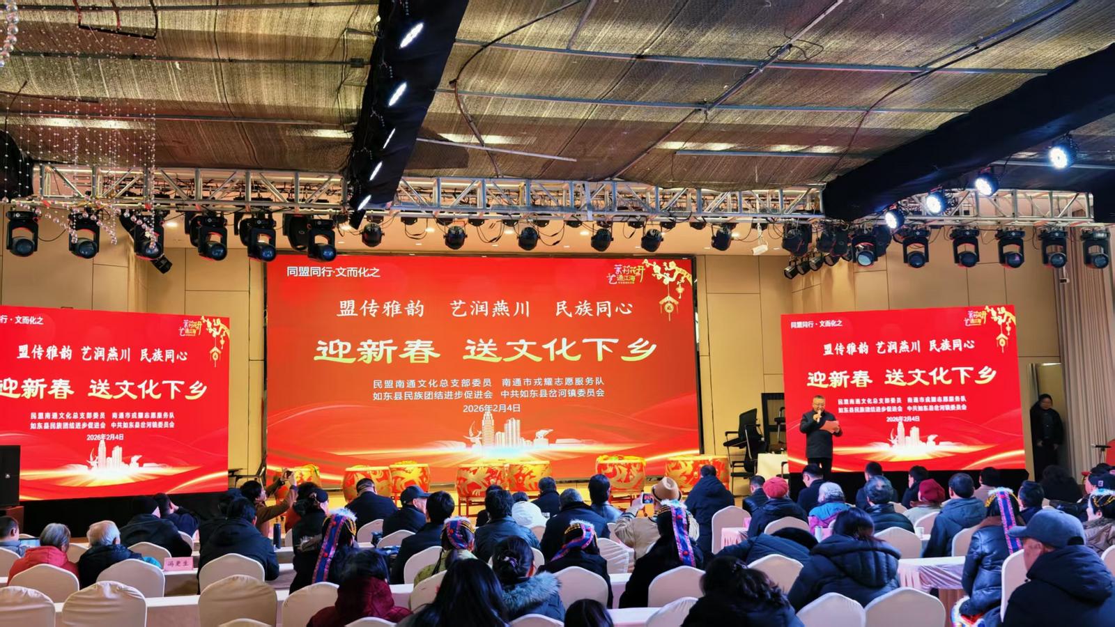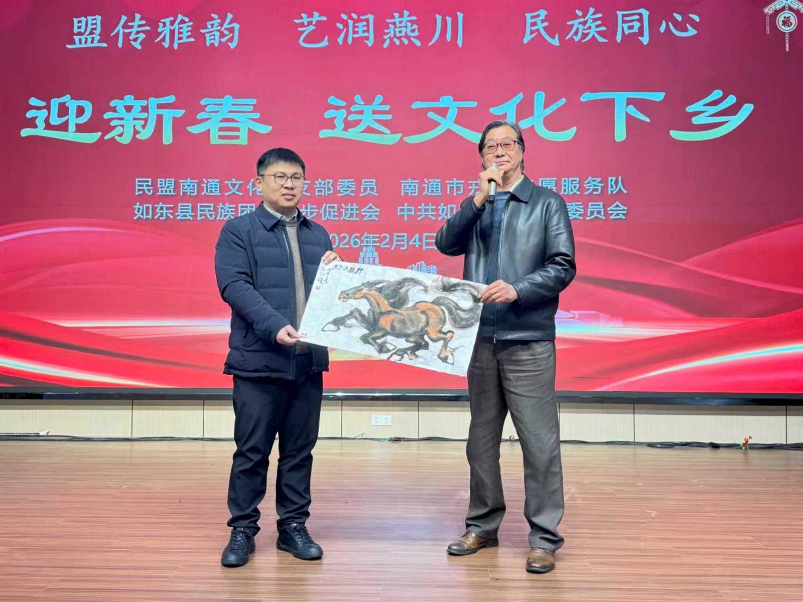 盟传雅韵,艺润燕川,民族同心。4日,由民盟南通文化总支部委员会、南通市戎耀志愿服务队、如东县民族团结进步促进会共同组织的新春文化下乡活动,在如东县岔河镇举行,文艺骨干们用歌声、书法为当地居民营造新春氛围,传递温暖年味。