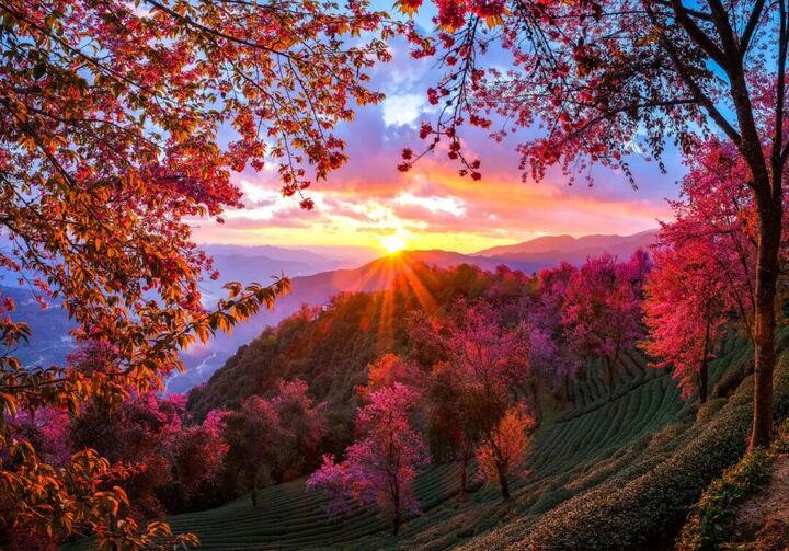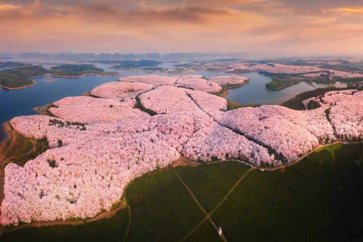 茶垄间,樱花次第绽放,