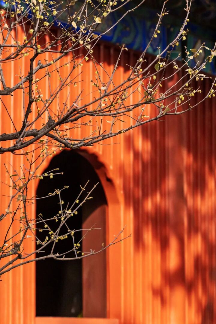 北京卧佛寺的古蜡梅倚红墙而立,