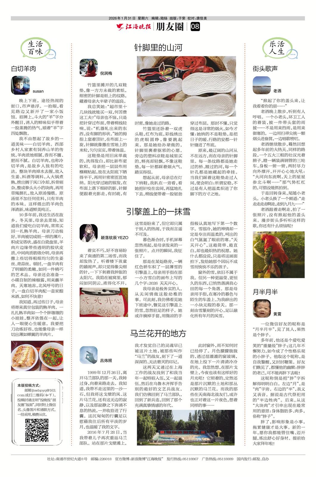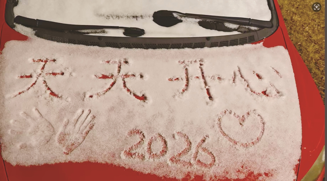 那是在某处路旁,一辆红色轿车积了一层薄雪的引擎盖上,母亲用手指在那一小方雪白的画布上写的几个字:2026 天天开心。