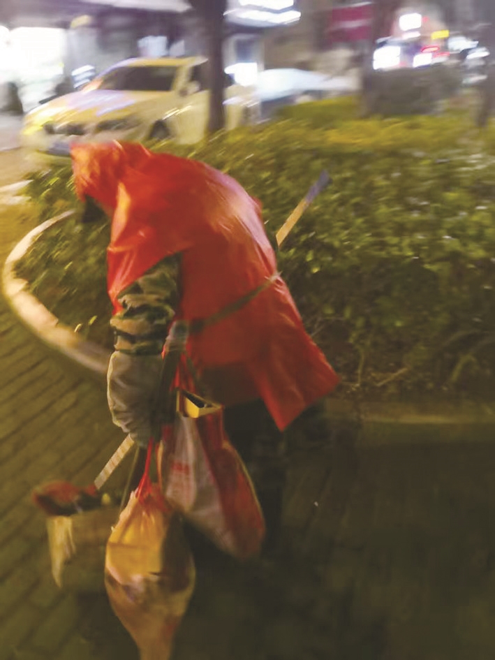 老洒晚上散步,听到有人哼唱。一个小老头,环卫工人的着装,披一件带头套的雨披——不是用来挡雨,是用来御寒的。一边用扫帚尖挑一颗烟头进畚箕,一边唱歌唠叨。