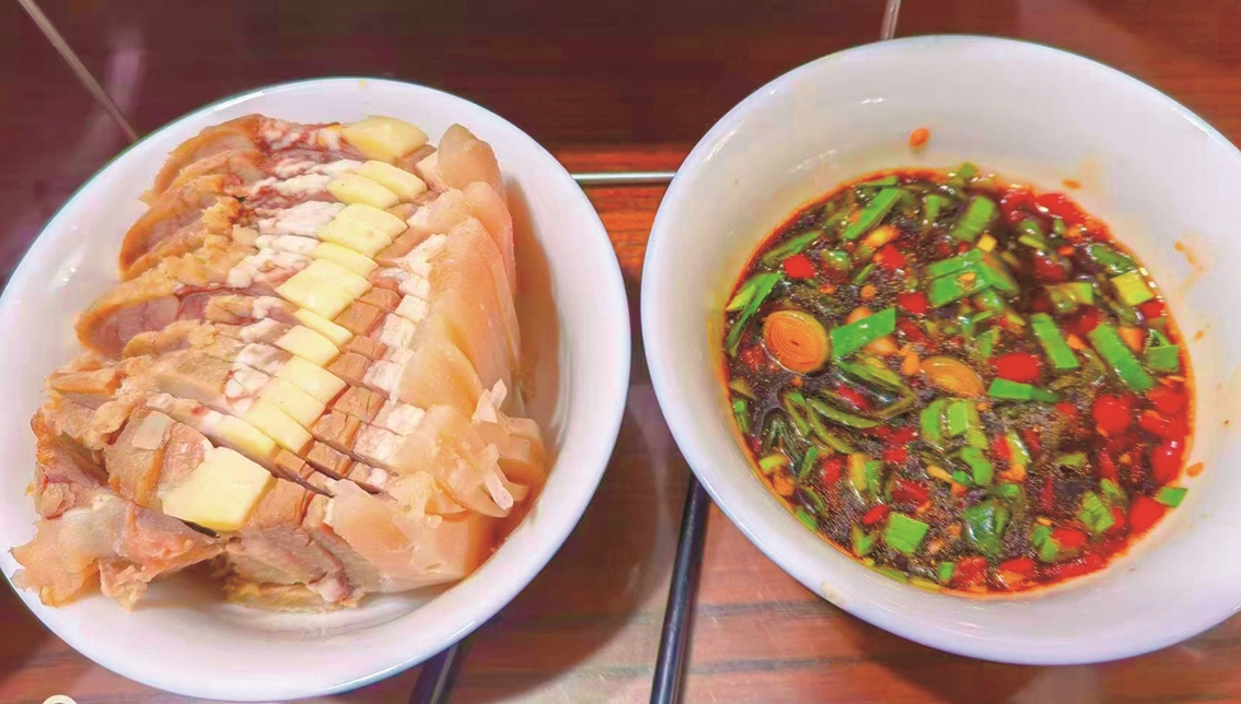 我不由想起了故乡的一道美味——白切羊肉。西部乡村人家素有饲养山羊的传统,羊肉质地细腻、香而不膻、肥而不腻。白切羊肉,也称冷切羊肉,是故乡人独有的吃法。整块羊肉焯水去腥,放入生姜、料酒等调料,入大锅煮熟,捞出搁于风口冷却,拆骨剔杂,整成拳头大小的块肉,再用草绳捆扎,放入原汤慢煨。原汤里不加任何佐料,只有羊肉的本味。这样煨出的羊肉色泽清新,味道鲜美纯正。