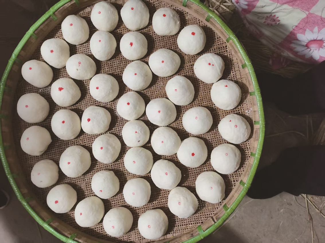 大舅哥家厨房灯火通明,屋里人影匆匆,忙碌而有序。厚厚的棉被掀开了,盖着的大缸露出真容,酵面特有的浓郁香气扑面而来;有人正利索地挖起暄软的面团,有人搬笼梯,有人抱柴禾……我加入桌边揉面做馒头的行列。大家熟练地抓起一团面,揉圆、压扁,麻利地裹进备好的馅料,手指翻飞间,一个个浑圆的馒头胚便像变魔术般立在掌中,又被整齐地码放进蒸笼。再用筷头蘸上洋红一点,便添了几分喜庆。待大铁锅里的水翻滚沸腾,十层蒸笼高高摞起,稳稳坐定锅上。