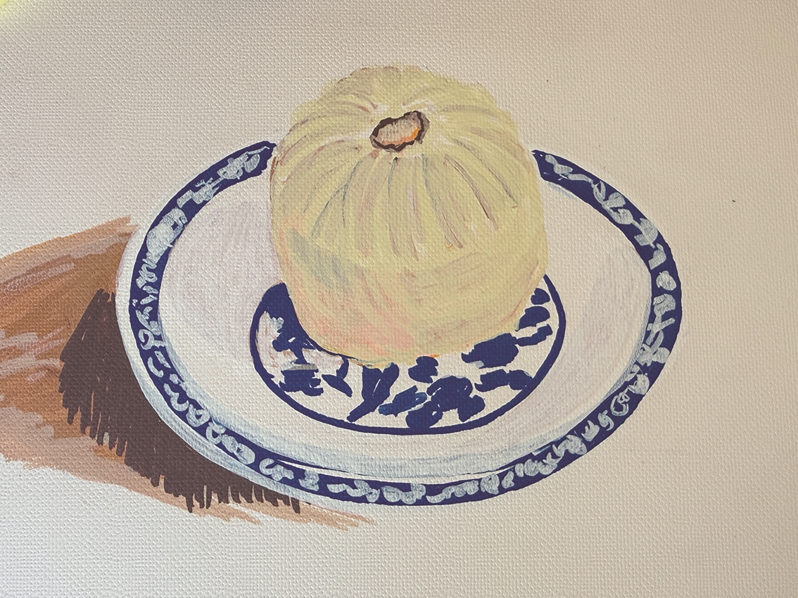 那一日的负暄闲坐,悠然自得,令我久久难忘。于是我想换一种方式留住它——用丙烯马克笔,在16K布面卡纸上画下了一只形似鸟笼的冬菜包子。