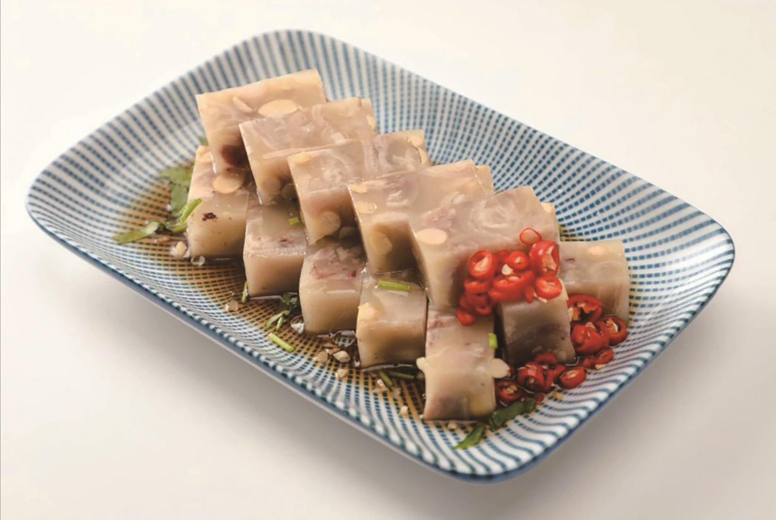 将拆好的肉、煮烂的黄豆与浓汤一同盛入瓷盆,静置一夜,次日清晨一盆晶莹剔透的黄豆猪脚冻便凝好了。倒扣在案板上,切成小块,淋上一勺香醋,撒一把翠绿的葱花,瞬间香气四溢。