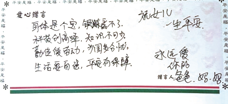 把合同翻到最后一页,中间有张卡片,写着“爱的赠言”,卡片上是老妈的字迹“身体是个宝,锻炼离不了。科技创高峰,知识不可少。勤俭爱劳动,为国多分忧。生活要自强,平安有保障。祝女儿一生平安”,落款是“永远爱你的爸爸妈妈”。提起往事,老妈目光温柔,指着卡片说:“这都是你爸想的,当时可把他难死了,一晚上没睡!”我问老妈,那时候那么难,怎么还想着给我上保险?老妈一脸骄傲地说:“那时候也没有别的想法,就想着我们俩也不知道能陪你多长时间,就想永远地给你一个保障。”