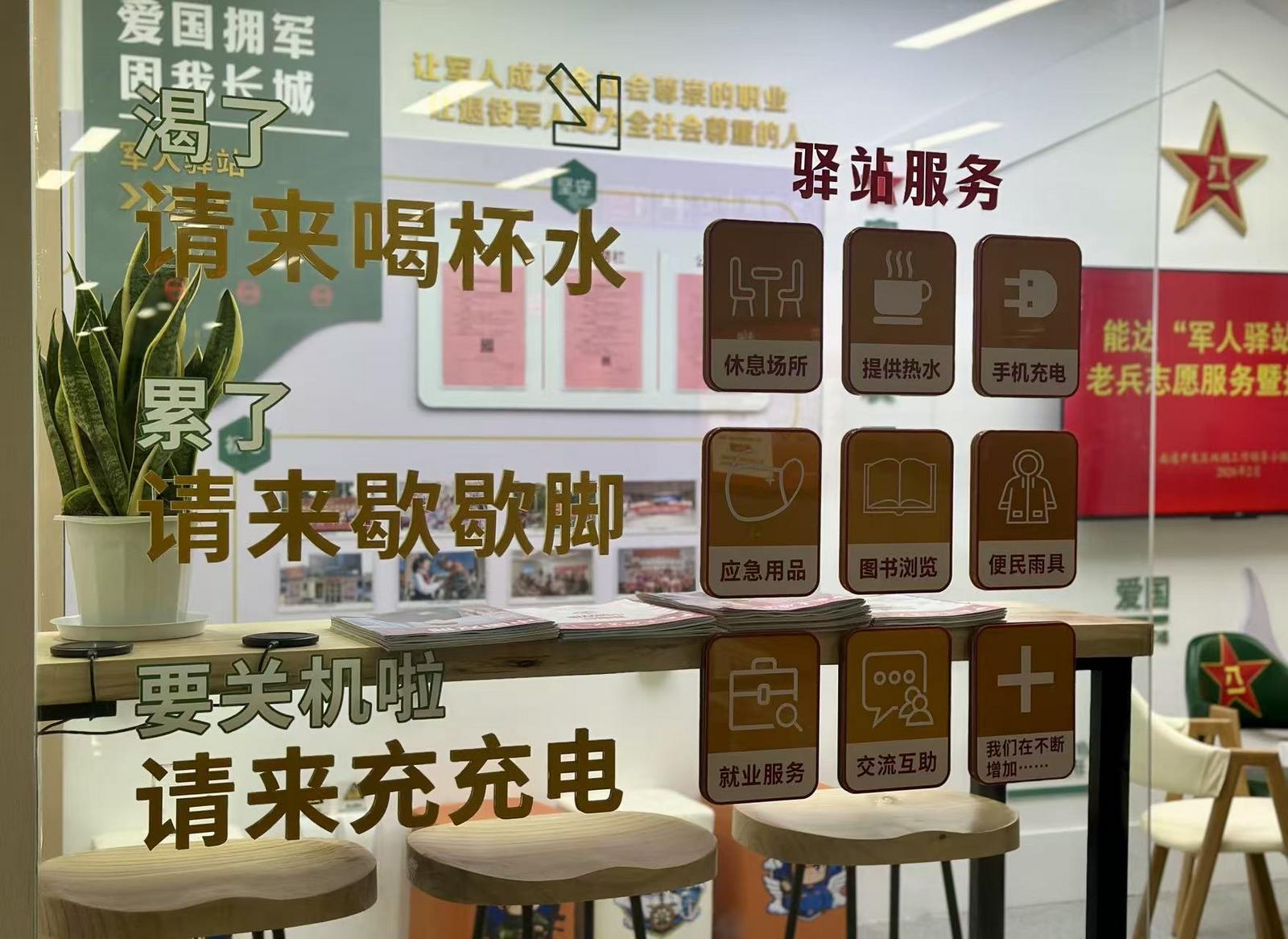 “铭记奉献 尊崇军人”“军爱民 民拥军”……走进驿站,迎面便是满满的军元素文化墙,电子屏里展播着展现军旅风采的视频;驿站里,有舒适的休憩区、饮用水供应点及临时办公空间,配备充电设施、急救药箱、雨衣等便民物资,还有“招聘栏”“公示栏”“求职栏”,促进退役军人与优质企业用人信息互通。