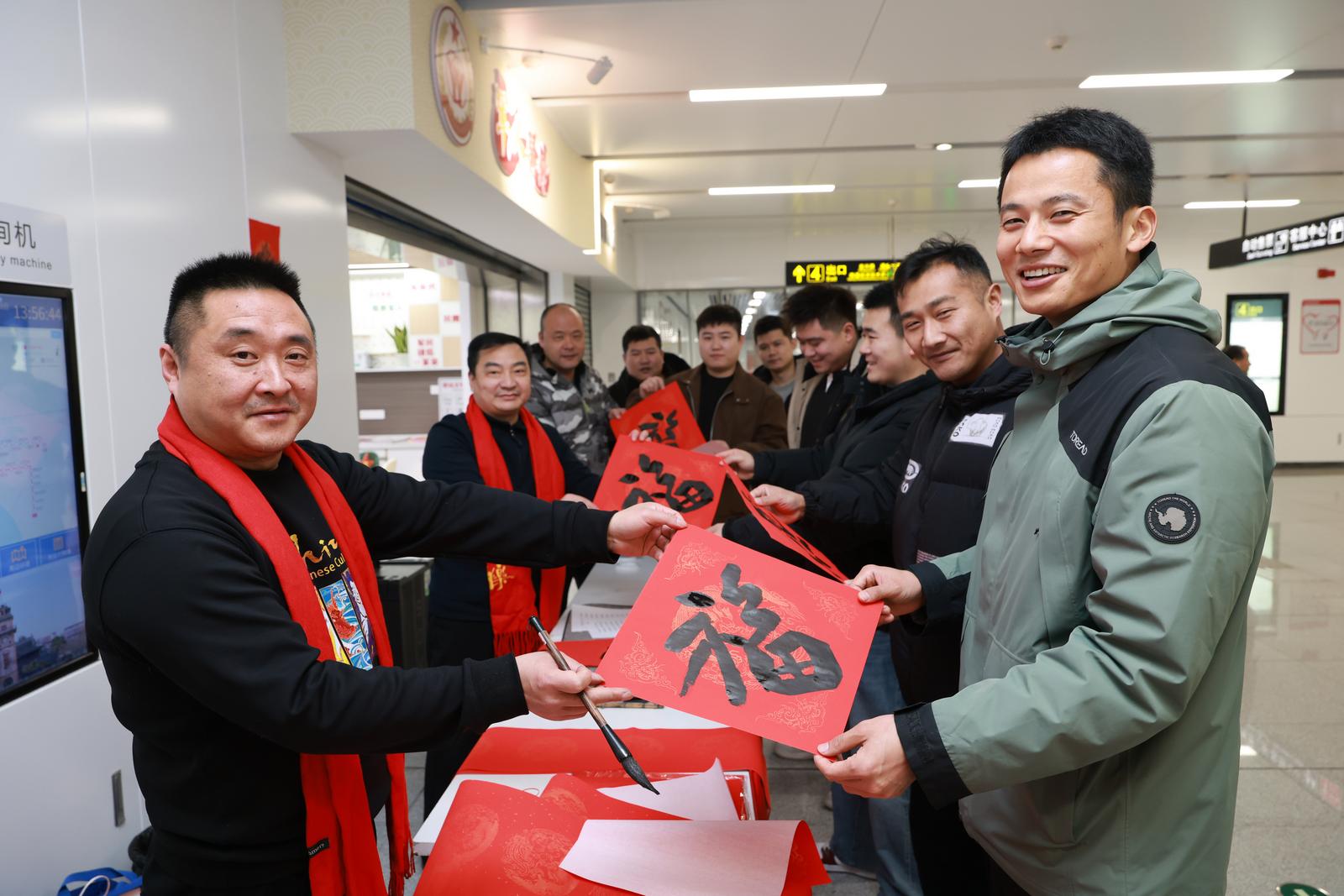 志愿服务活动现场,退役老兵书法家们凝神挥毫、笔走龙蛇,将新春的美好祝愿与军民同心的深厚情谊写在大红福字与春联之上;身着红色马甲的退役军人志愿者穿梭其间,主动为地铁站工作人员、过往乘客送上年画、福字和新春问候,一句句真诚的祝福、一副副喜庆的春联,让人们在匆匆步履中感受到浓浓的年味与尊崇暖意。