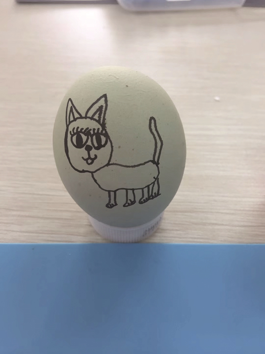 经过大量图片素材的启发,孩子们的创意层出不穷,桌角冒出个“新品种”:一颗青壳鸡蛋上,画着只高翘尾巴的小猫,长睫毛忽闪着,嘴角上扬,四条小短腿并排而立,格外生动,仿佛一个招呼,马上“喵呜”一声跳出蛋壳。