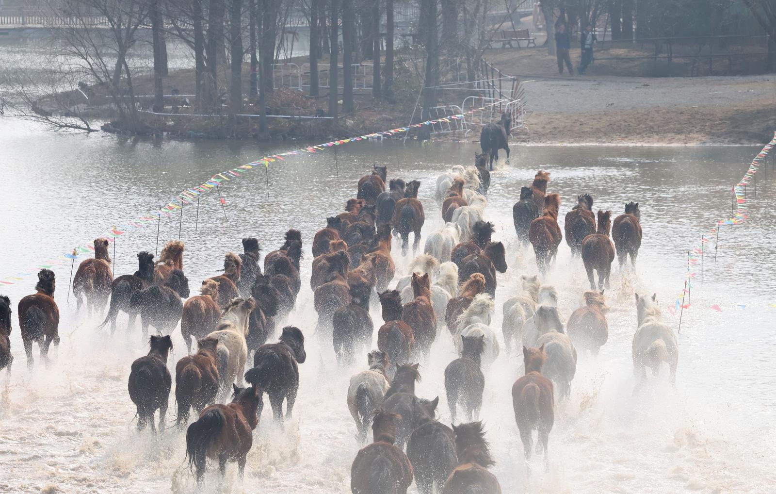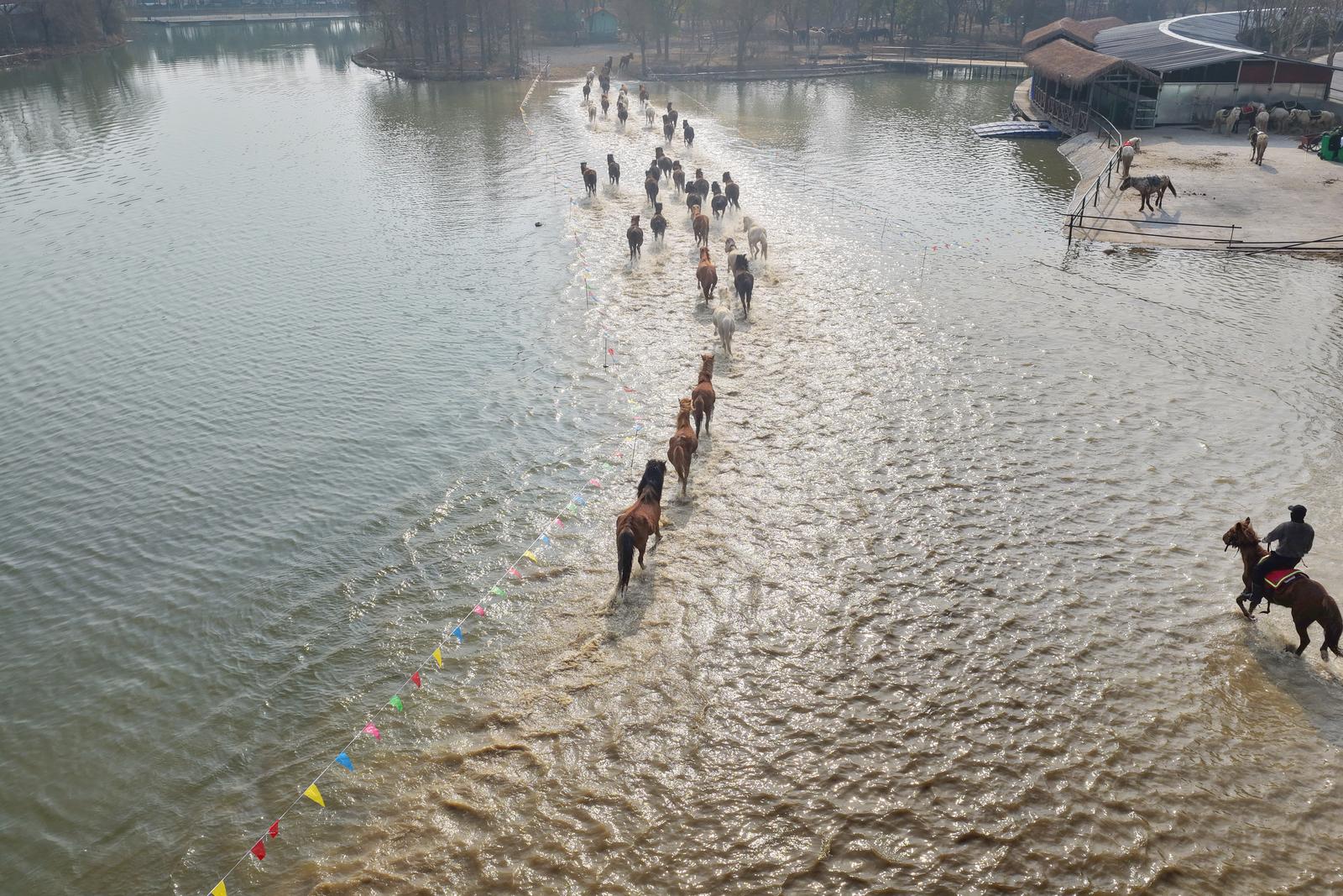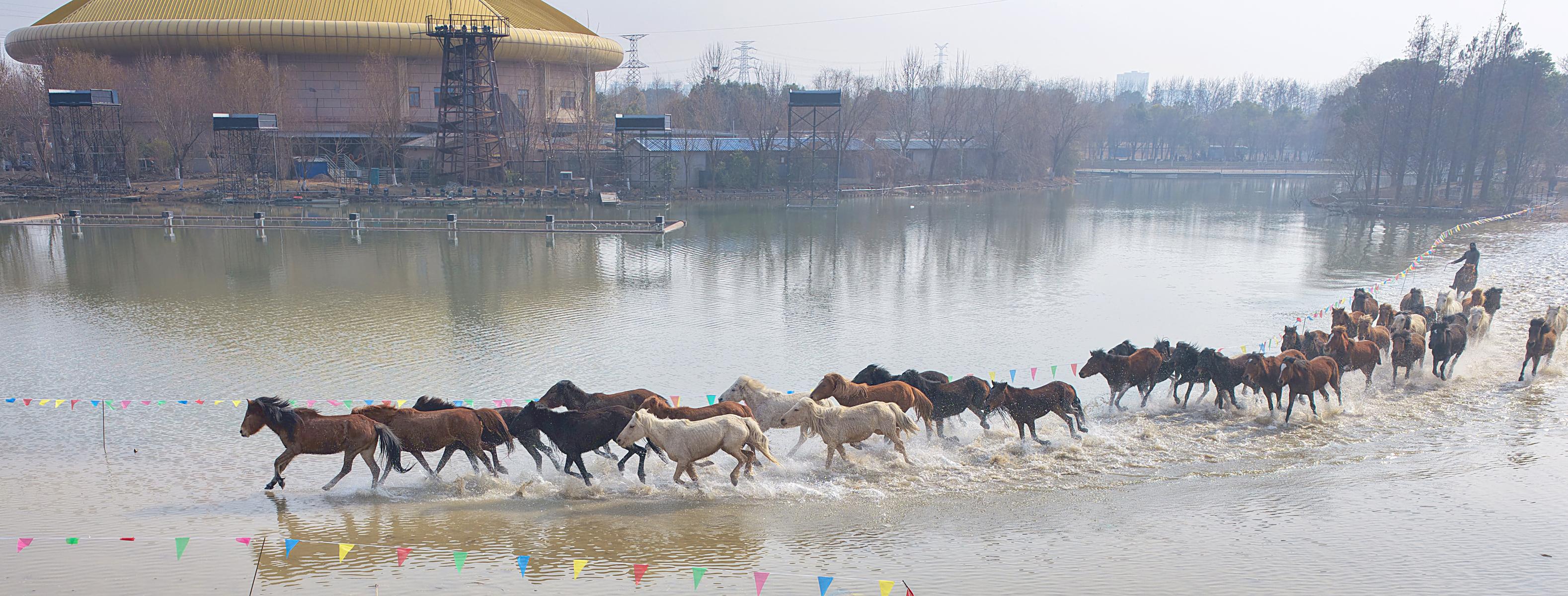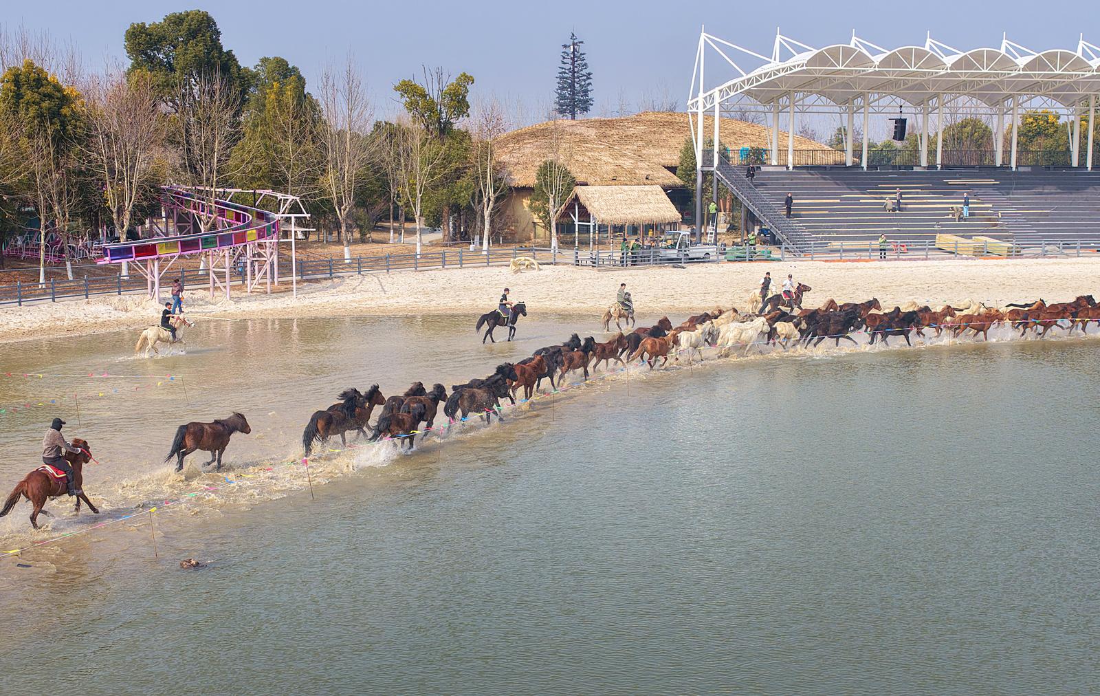 2026年2月12日在南通森林野生动物园拍摄的正在排练的全新大型主题节目《天马浴河》,该节目将于今年春节假期上演。百匹从西部引进的骏马踏浪驰骋,水花四溅。节目内容还包括叼羊、套马、拾哈达、射箭等,内容丰富的《天马浴河》为马年春节增添了多彩的内容。