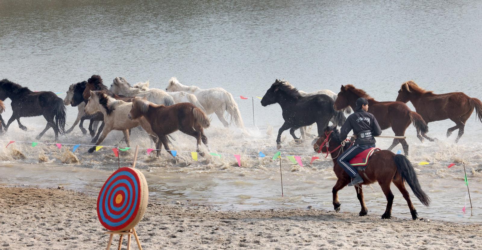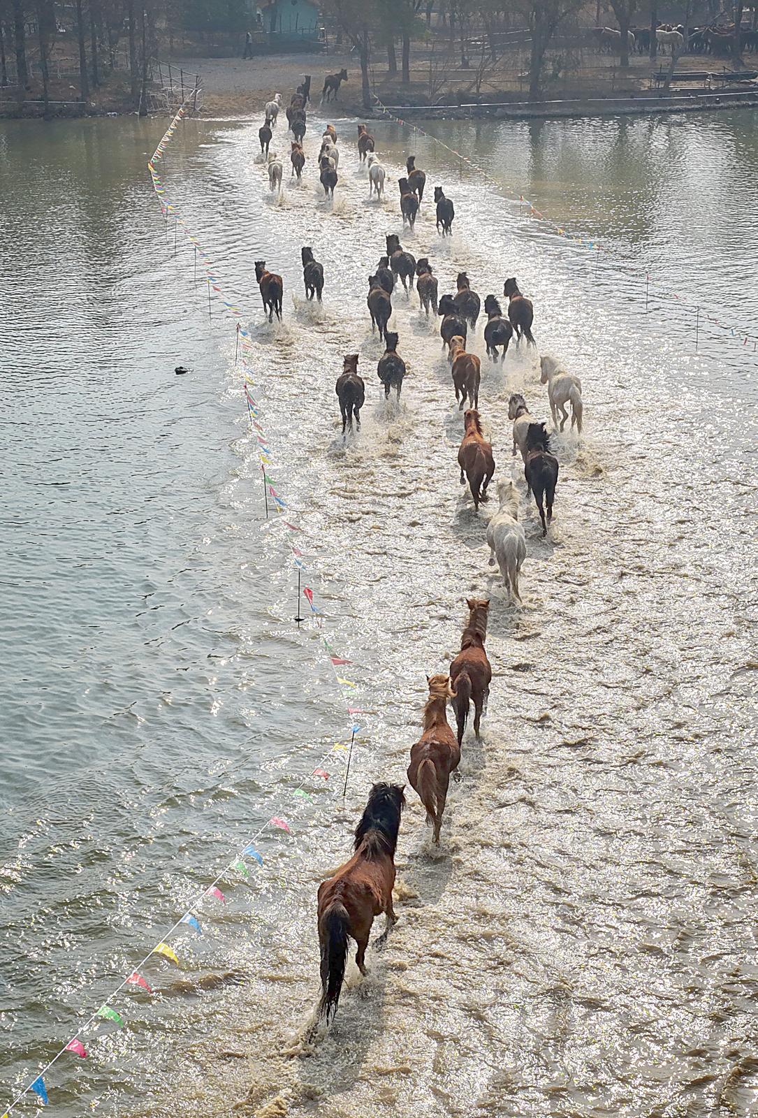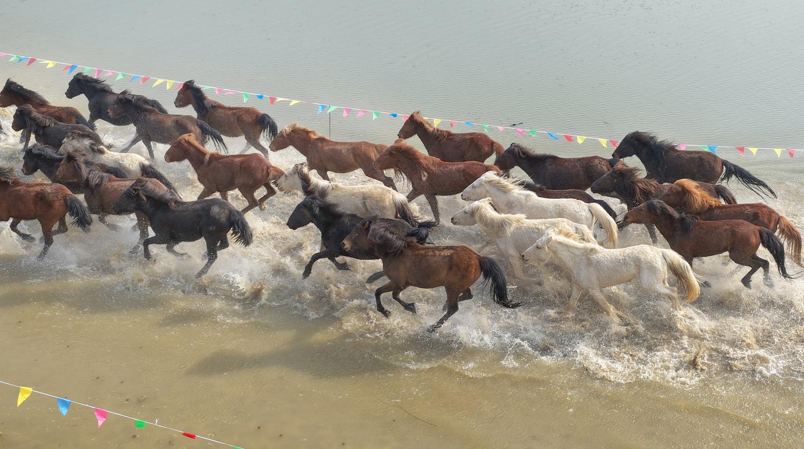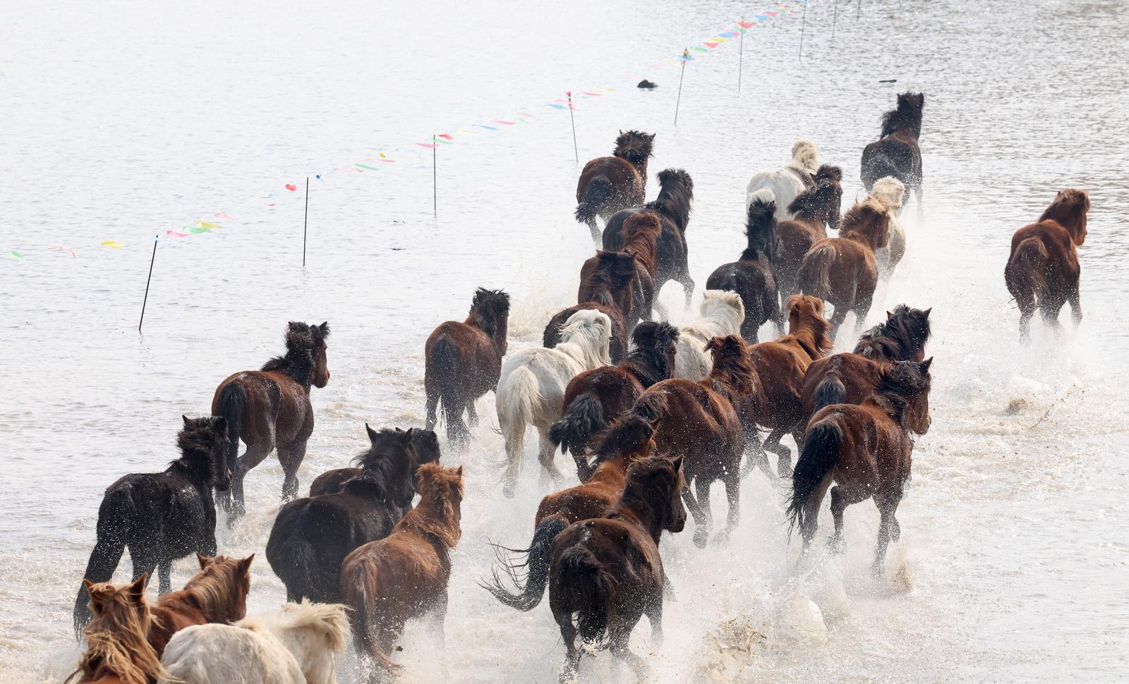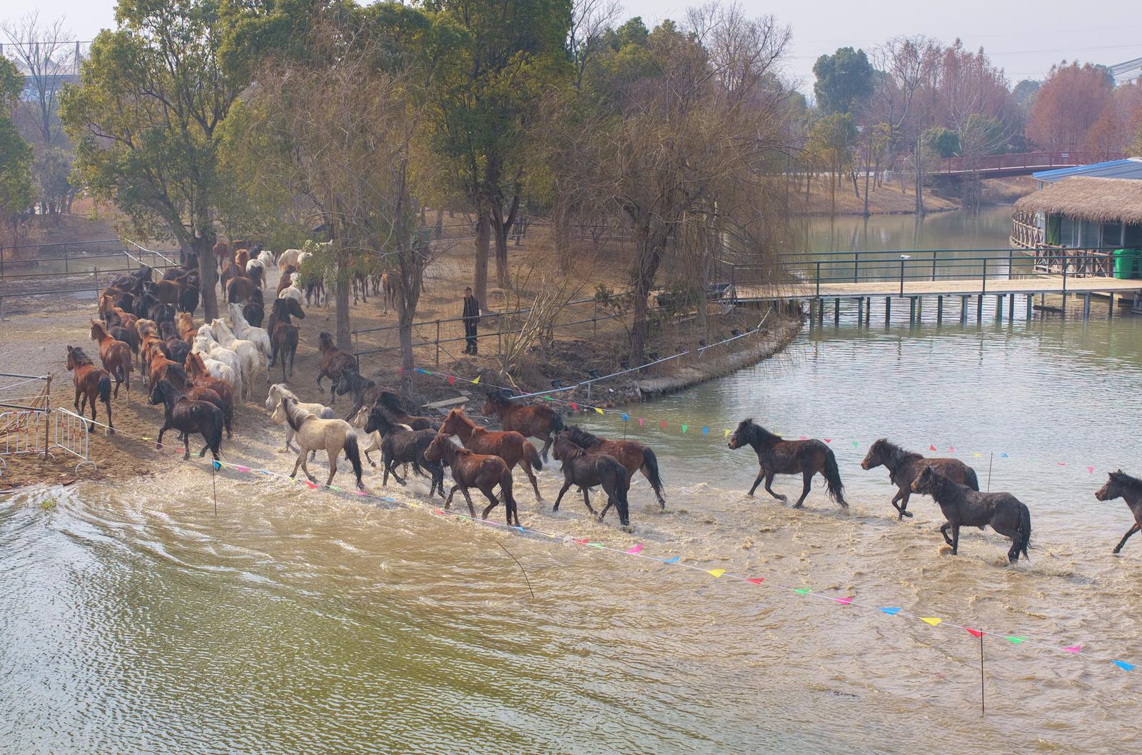 2026年2月12日在南通森林野生动物园拍摄的正在排练的全新大型主题节目《天马浴河》,该节目将于今年春节假期上演。百匹从西部引进的骏马踏浪驰骋,水花四溅。节目内容还包括叼羊、套马、拾哈达、射箭等,内容丰富的《天马浴河》为马年春节增添了多彩的内容。