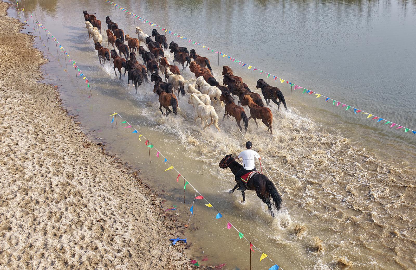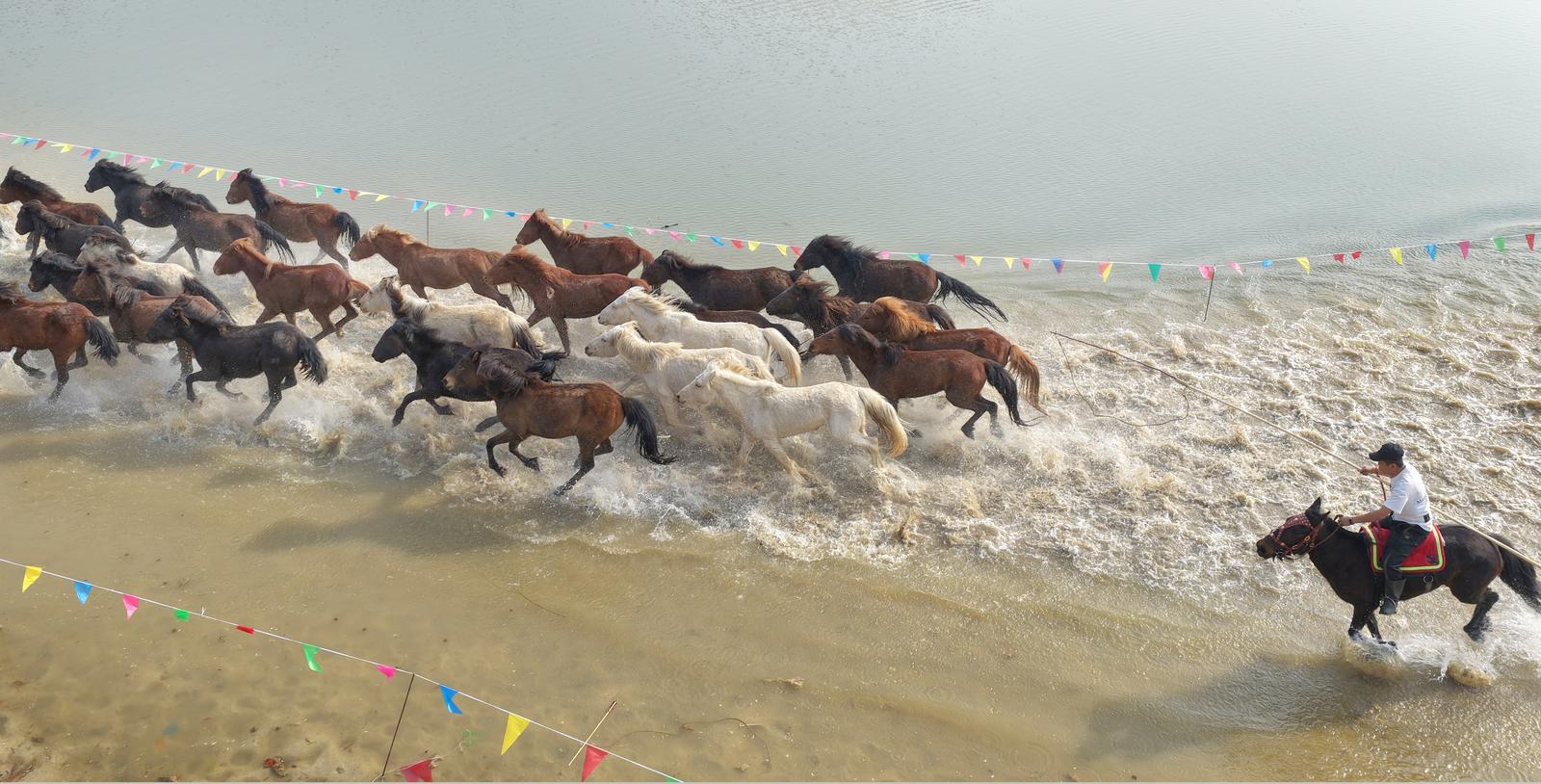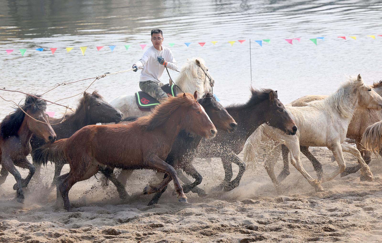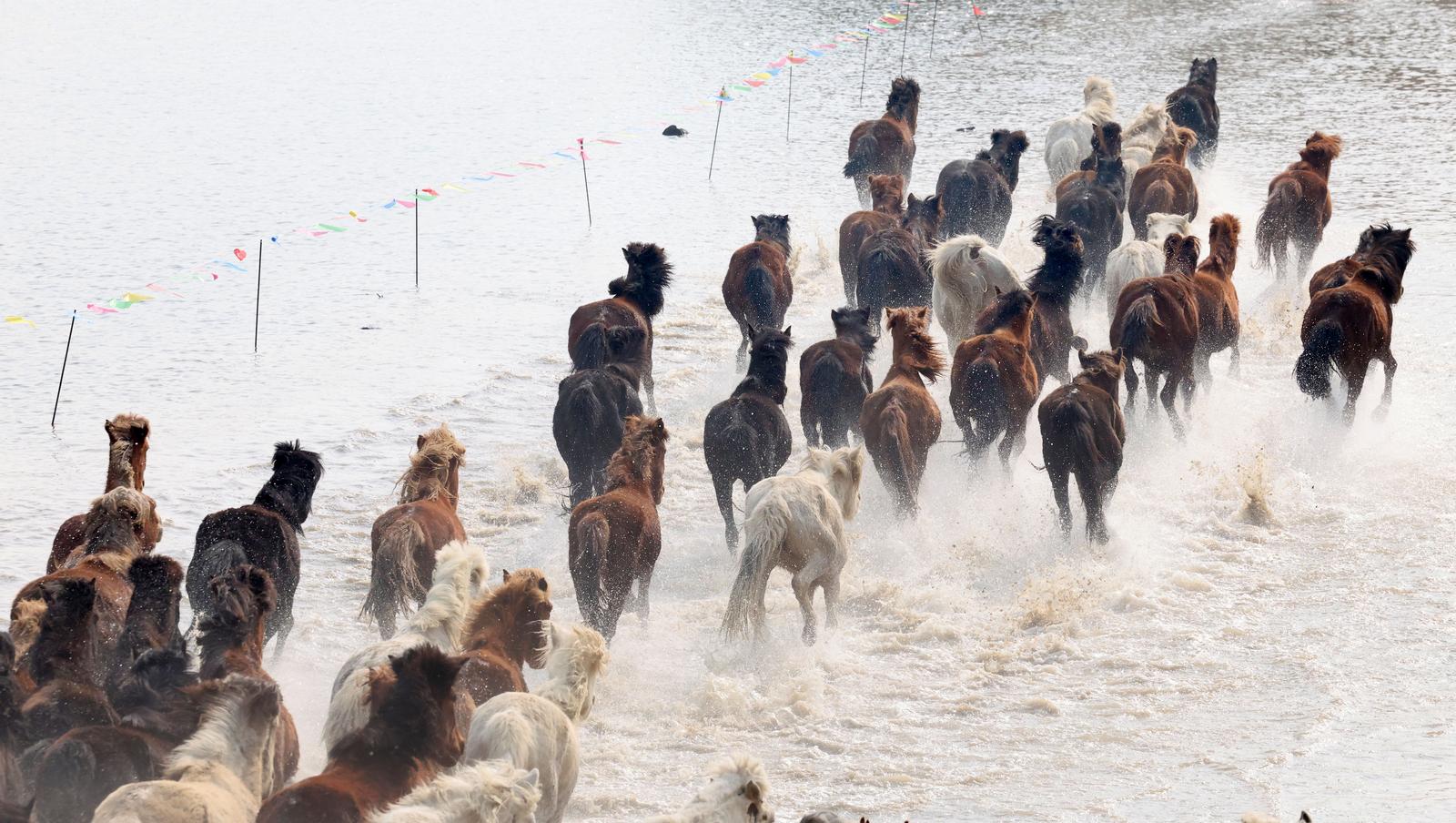 2026年2月12日在南通森林野生动物园拍摄的正在排练的全新大型主题节目《天马浴河》,该节目将于今年春节假期上演。百匹从西部引进的骏马踏浪驰骋,水花四溅。节目内容还包括叼羊、套马、拾哈达、射箭等,内容丰富的《天马浴河》为马年春节增添了多彩的内容。