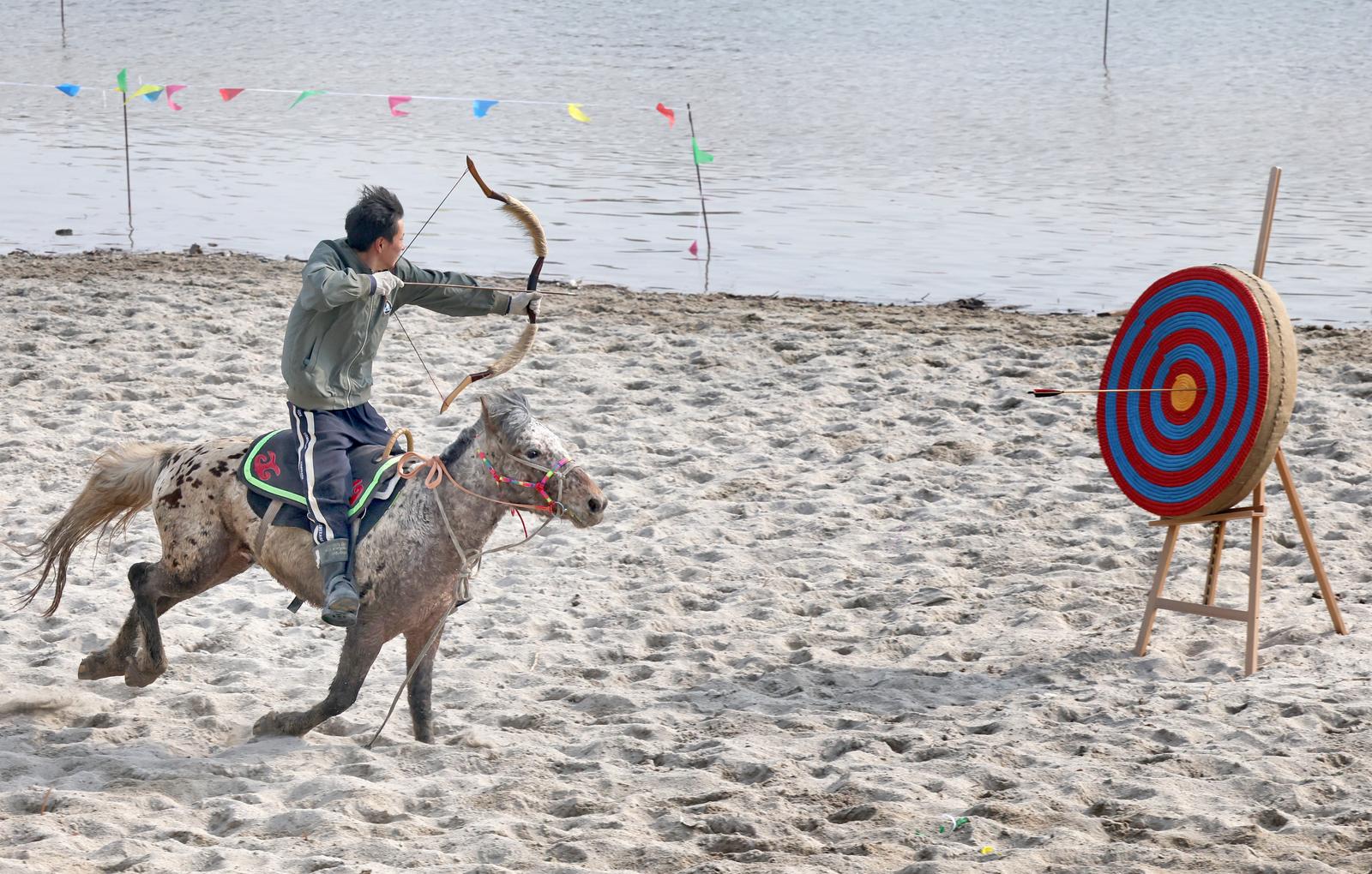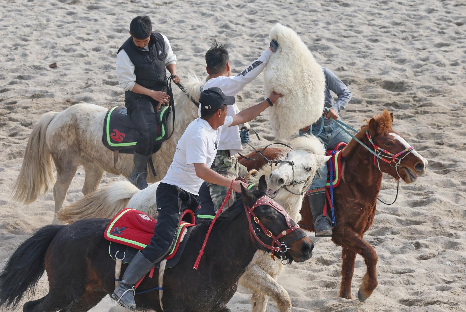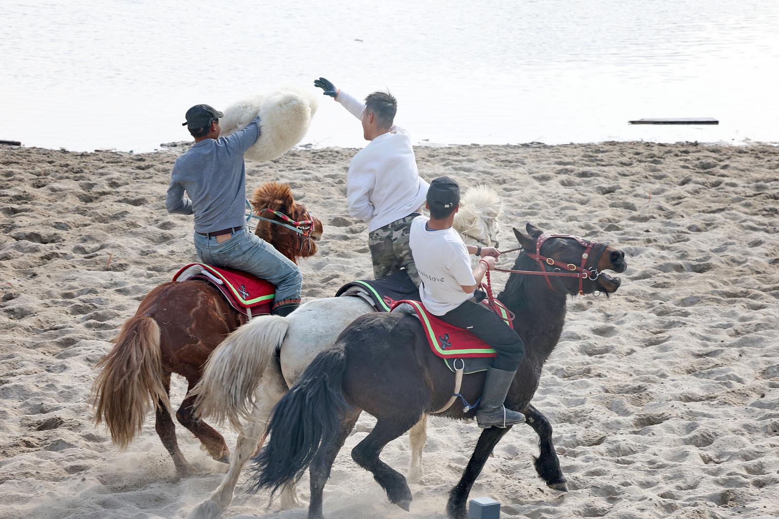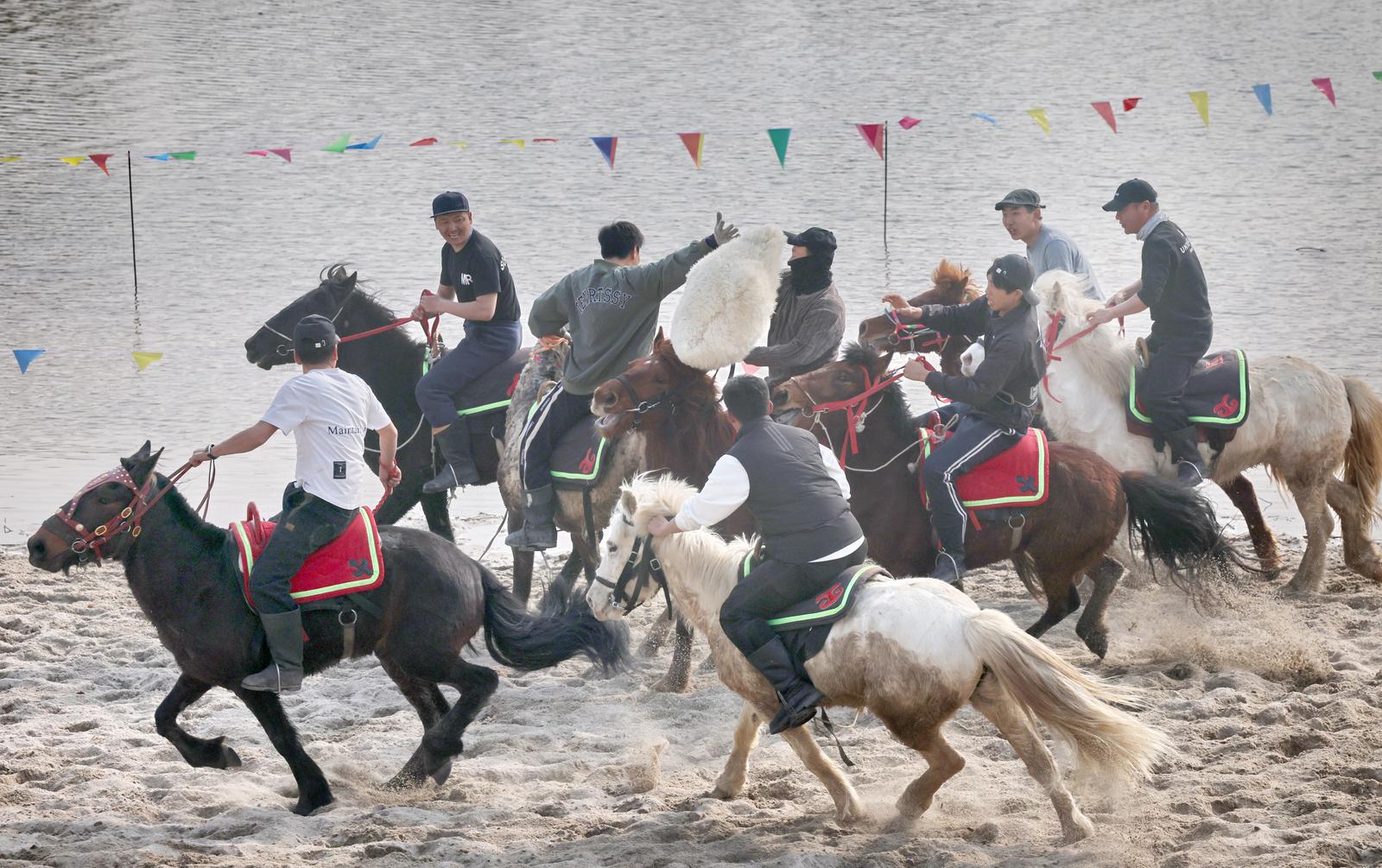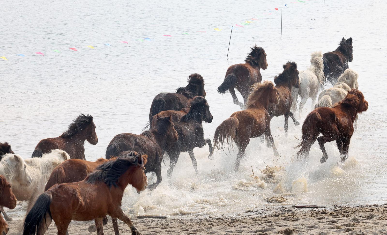2026年2月12日在南通森林野生动物园拍摄的正在排练的全新大型主题节目《天马浴河》,该节目将于今年春节假期上演。百匹从西部引进的骏马踏浪驰骋,水花四溅。节目内容还包括叼羊、套马、拾哈达、射箭等,内容丰富的《天马浴河》为马年春节增添了多彩的内容。