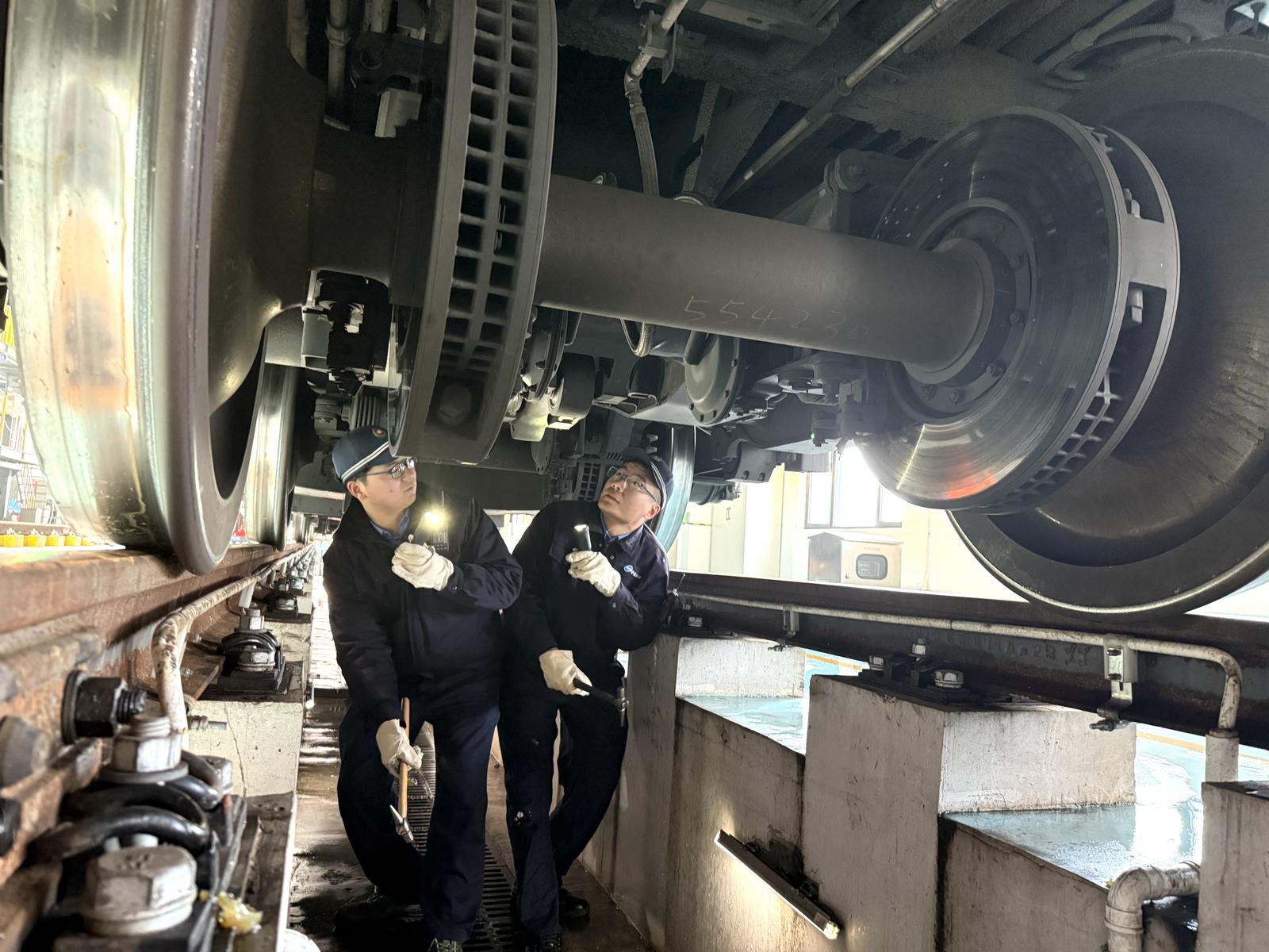清脆的敲击声在检修车间回荡。一辆25T型软卧车旁,一位年轻小伙正半蹲在地,一手持手电筒,一手握锤,边敲边看,不时凑近细听。