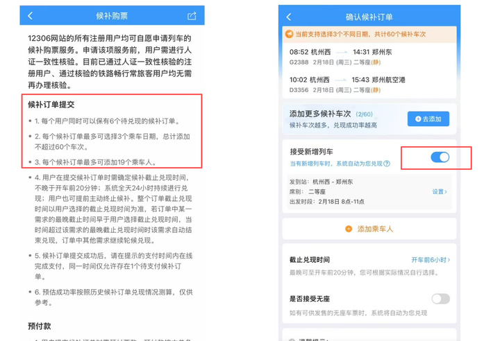 旅客朋友可以通过铁路12306查询夜间高铁列车开行相关信息并购买车票,也可使用铁路12306候补购票功能,勾选“接受新增列车”选项。