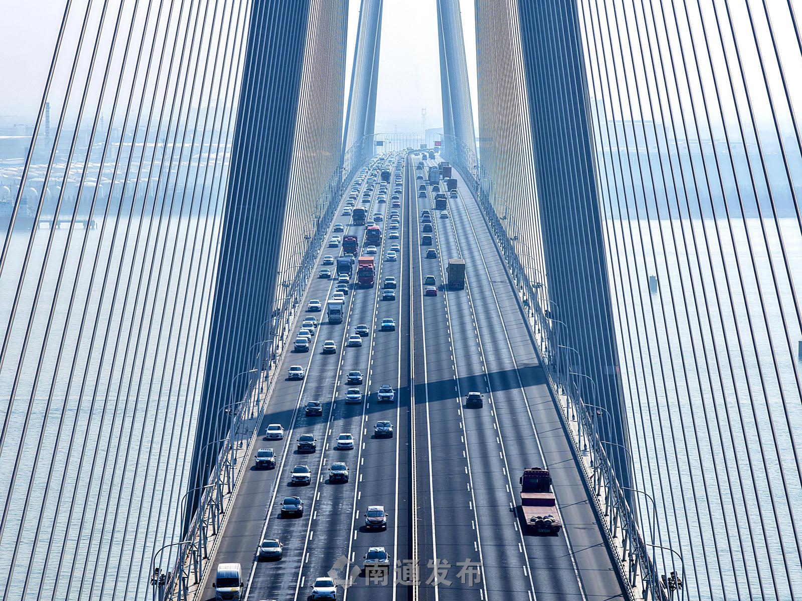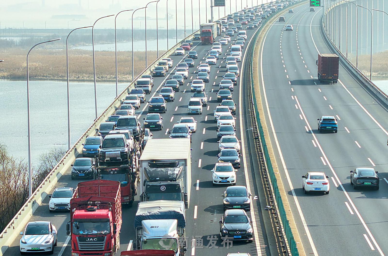 2026年2月13日在G15沈海高速苏通大桥拍摄的车流高峰。G15沈海高速南通段出现春节前从南向北返乡车流高峰,部分路段车流量大、车行缓慢、拥堵。