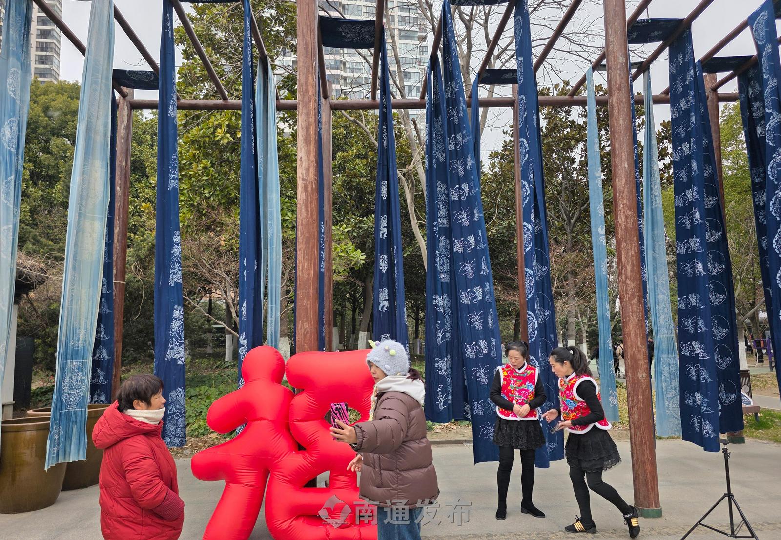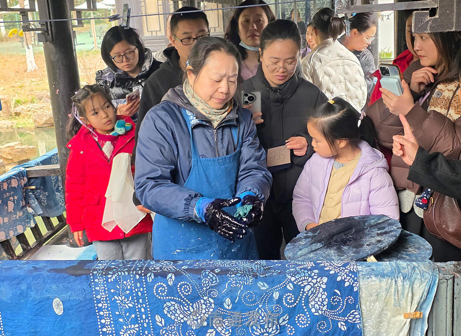 2026年2月19日在南通蓝印花布博物馆拍摄的画面。99岁管惠芳非遗传承人演示染织技艺,春节假期以来,每天都有2000多位市民、游客来到南通蓝印花布博物馆参观、体验国家级非物质文化遗产蓝印花布印染技艺,制作蓝染方巾、围巾等,感受身边非物质文化遗产的魅力。