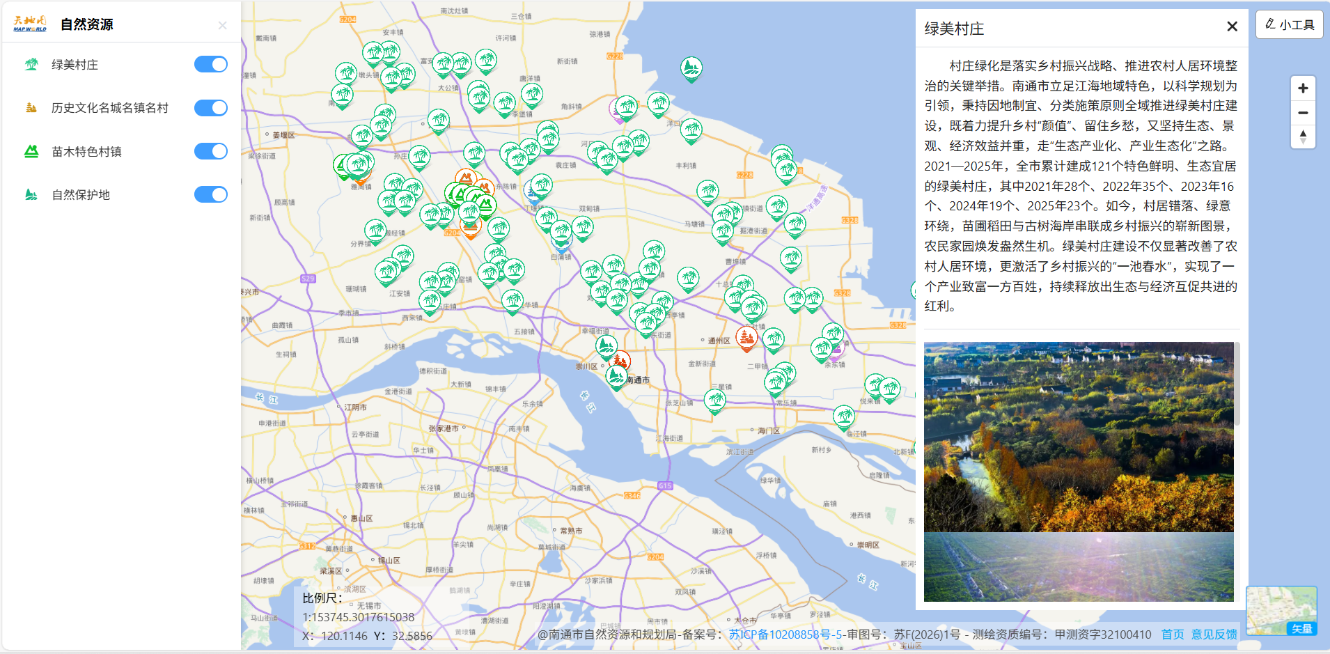 升级后,平台首次开设自然资源专栏,新增“绿美村庄”“历史文化名城名镇名村”“苗木特色村镇”“自然保护地”四个板块,补充汇集了相关专题地理信息数据。点开专题,绿美村庄、历史文化名城、国家公园、自然保护区在全市的地理位置分布、图文信息简介等清晰可见。