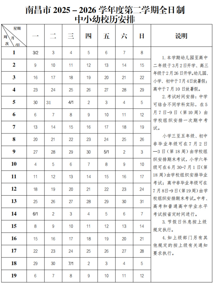 江西全省高三年级统一于2月26日开学,幼儿园、小学、初中及高一、高二年级统一于3月2日正式上课。春季学期总时长19周,减去假期和周末后,实际教学天数同样低于90天。