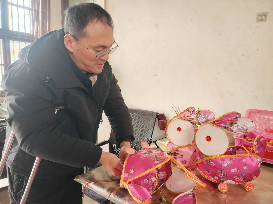 十八岁那年,强直性脊柱炎无情地困住了陈泉,脊背僵直、行动不便,曾经的青春意气被病痛磨去棱角。漫长的岁月里,他一度困于方寸小屋,看不到前路的光亮。但他从未向命运低头,在残联的帮助下,主动报名参加省里的非遗灯彩培训,从零学起兔儿灯制作。课堂上,他忍着身体的酸痛,反复练习骨架绑扎、布料裱糊,别人一遍学会的技艺,他便花十倍的工夫琢磨,硬是把这门手艺刻进了骨子里。