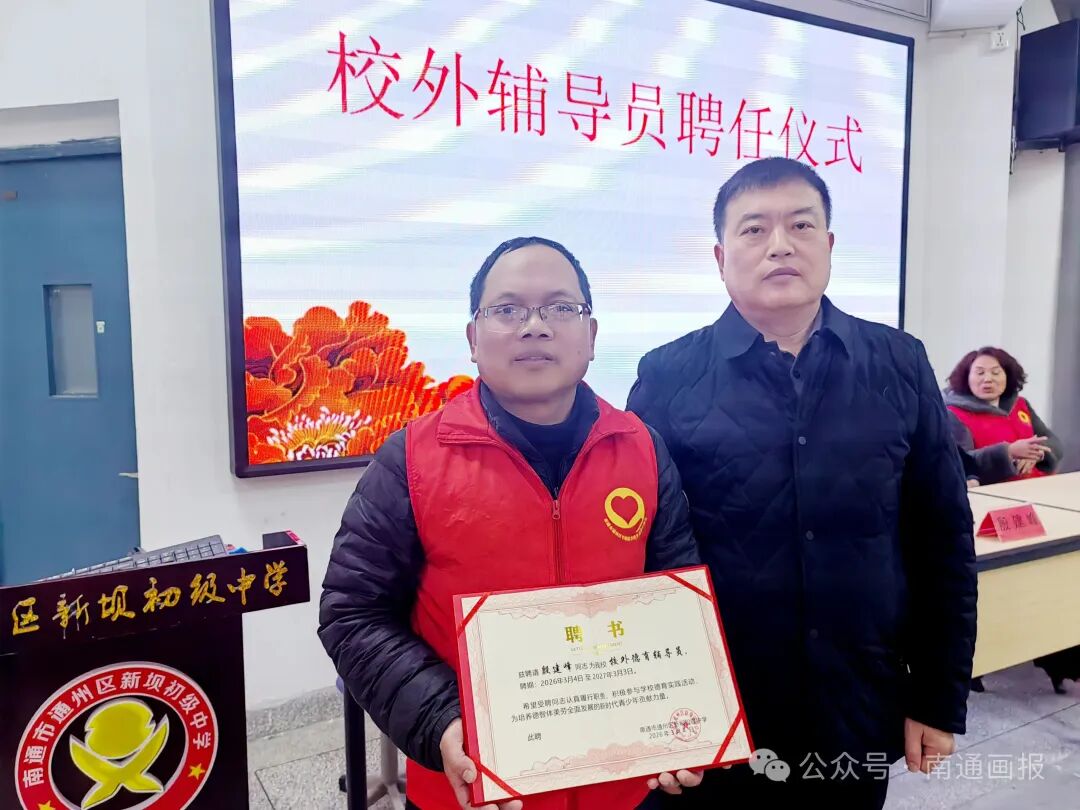 仪式中,“通州好人”、协会副会长金红娟向学校团总支书记施婷婷授予“吉坝乡连”学雷锋志愿服务总队新坝初中分队队旗。学校正式聘请殷建峰担任校外德育辅导员并颁发聘书。
